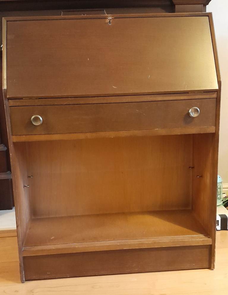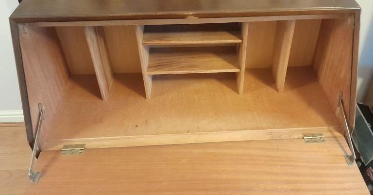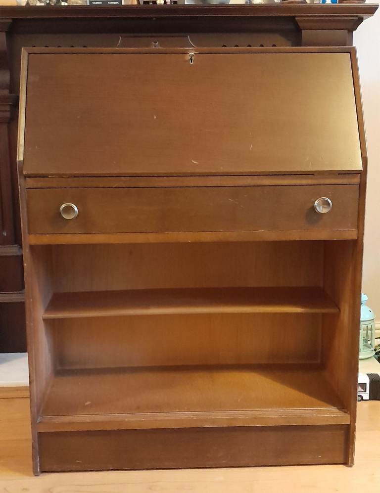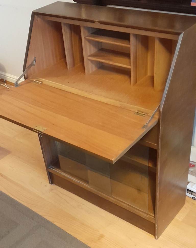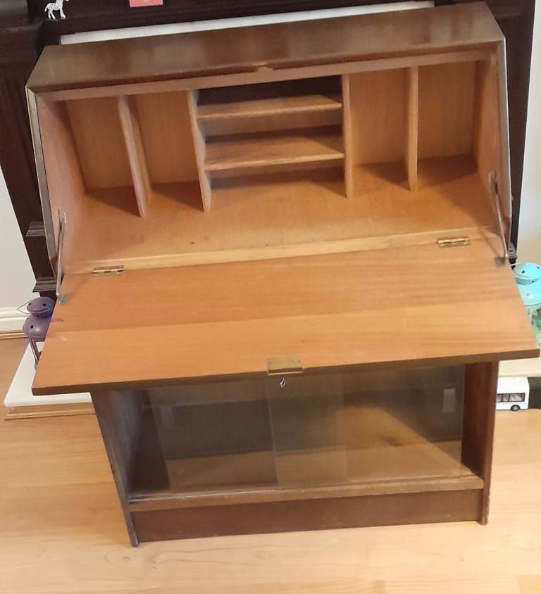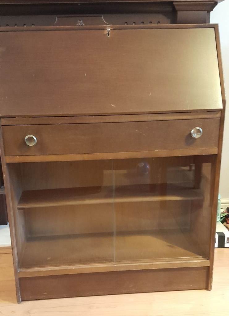 Relatively lightweight and easy to manoeuvre, a practical and fun place to keep your records and personal information handy and secure. Has scratches and patina commensurate with age but no serious damage. Shelf in bookcase area can be easily removed, as can the glass for transit. Collected Erskine or can be delivered locally.