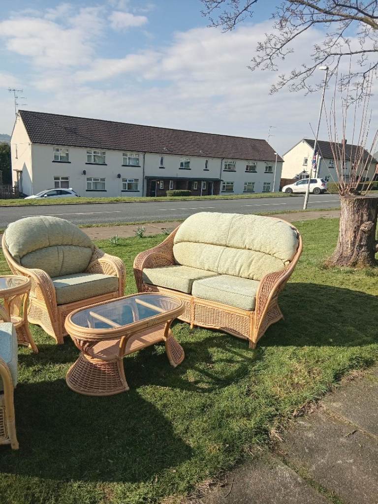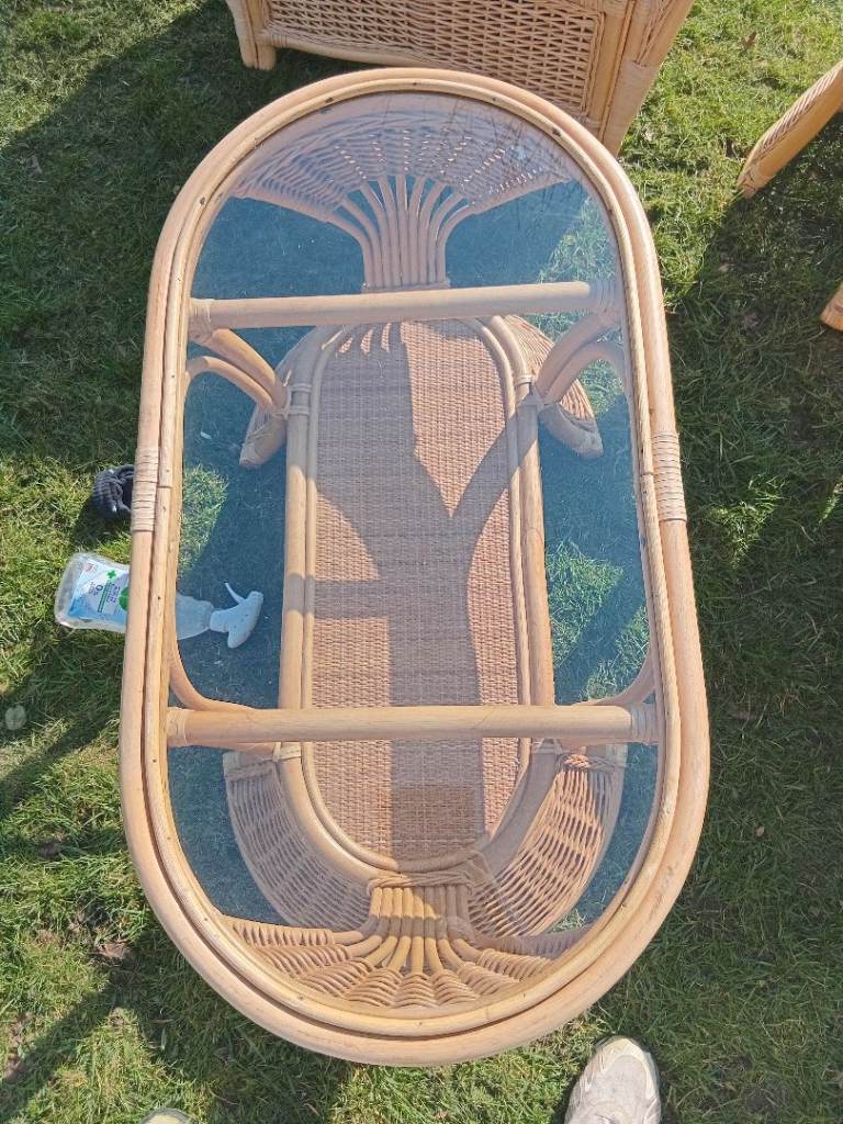 2 sealer 2 chairs glass table glass coffee table cane bases with modern cushions as new only a few months old