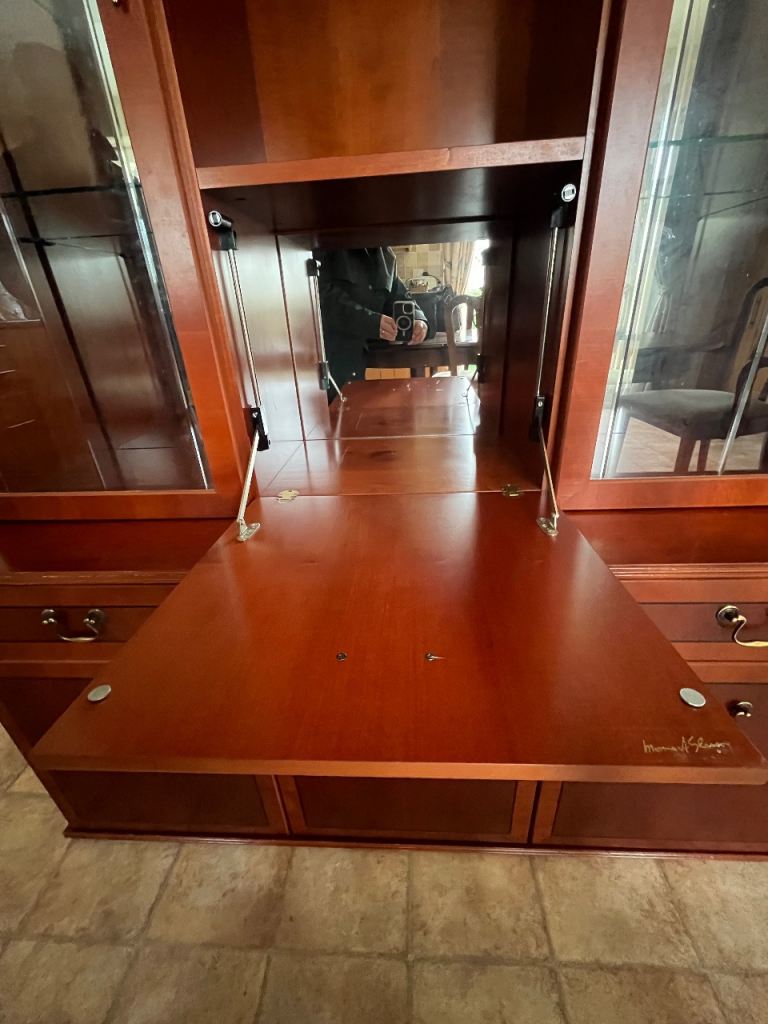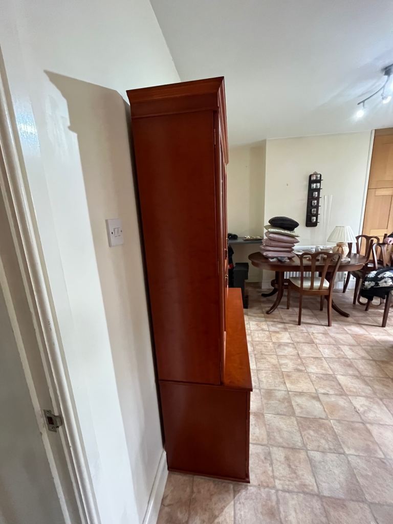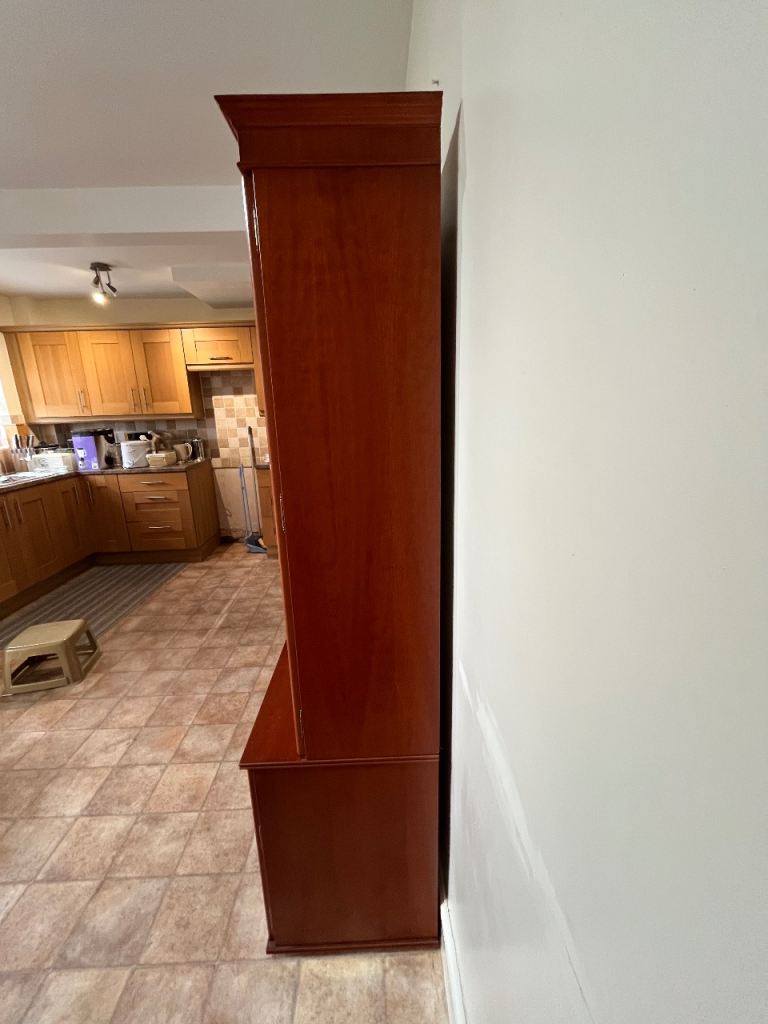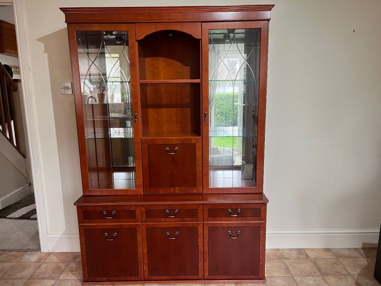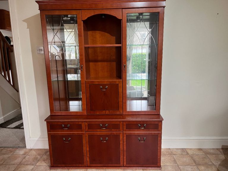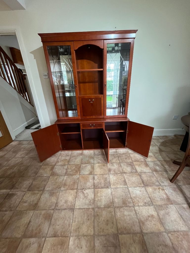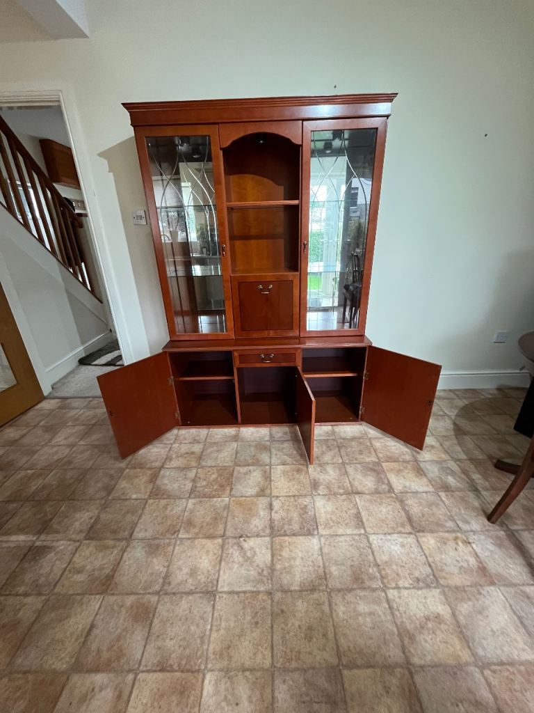 Double fronted glass display upper with central drop down mirrored cabinet. Base has 3 cupboard, central cupboard smaller with drawer above. Height 6’, width 4’4”, depth, base 1’ 6”, Transportable in 2 sections