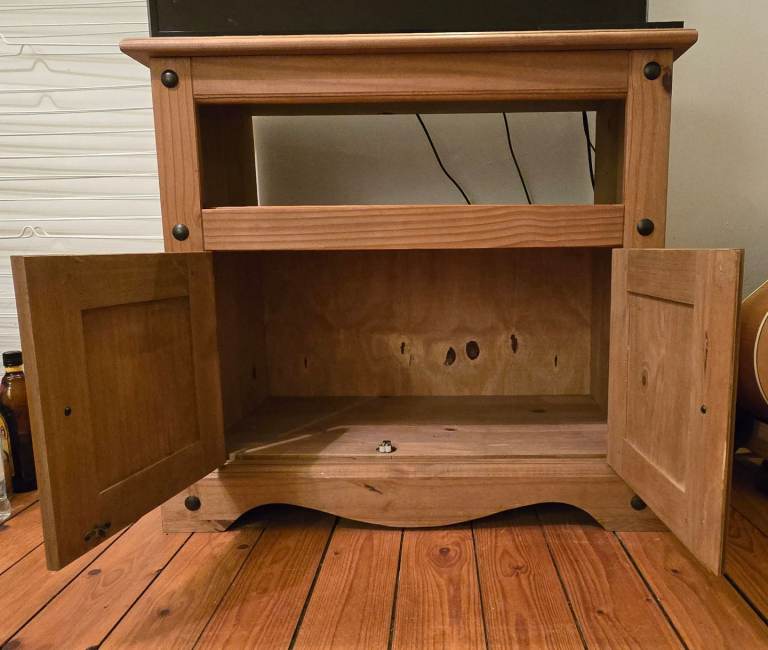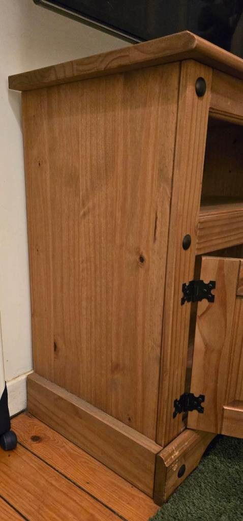 Used wooden TV stand/drinks cabinet in good condition apart from a few marks on the bottom left and a wee scratch on the bottom right, as shown in the photo.