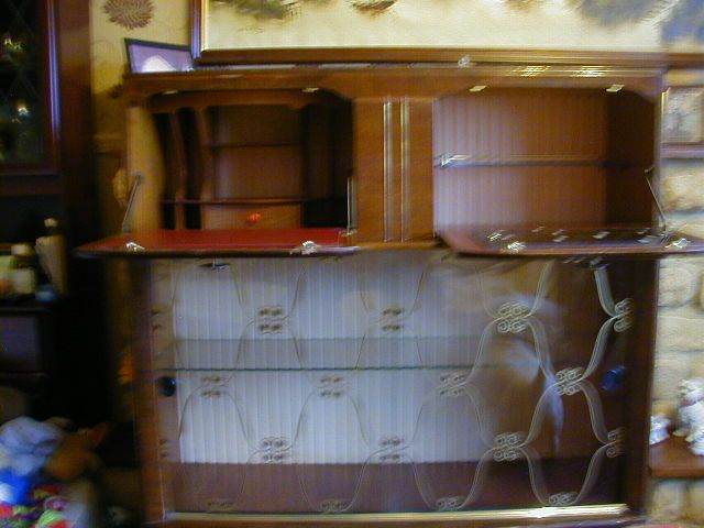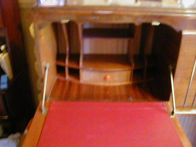 Writing bureau with drinks cabinet and class display cabinet size approx height 44ins (112cm) length 42ins (107cm) width14ins (36cm) colour mahogany slightly damaged £ 40.00 ono