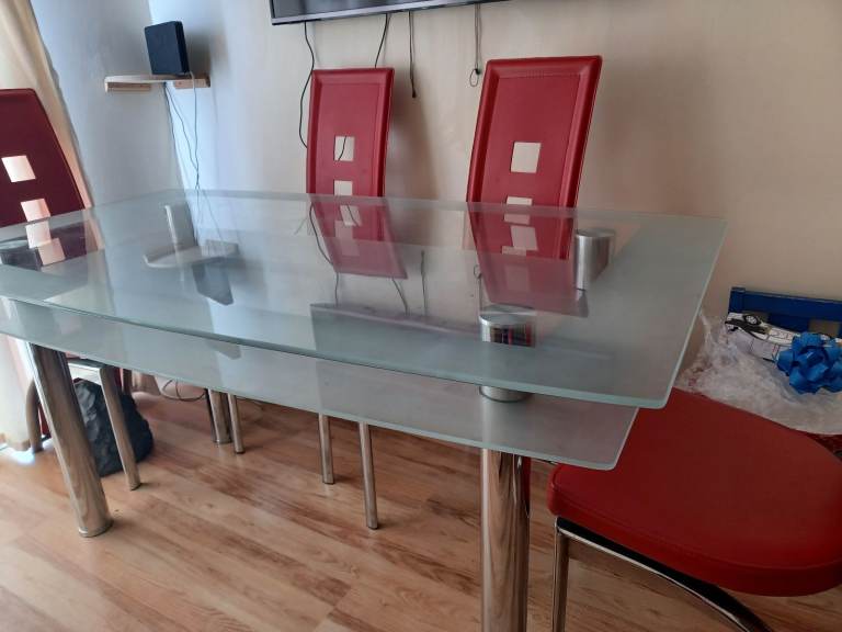 Comprising round glass top table w760mm x d760mm x h760mm and two matching chairs in a neutral mushroom colour - suit kitchen, dining/coffee area or conservatory. This set is in excellent condition, has had little use and is a real collectors item with original labels. Only for sale as surplus to requirements following house move. Buyer to collect/arrange collection.