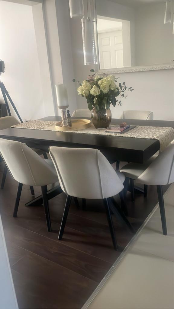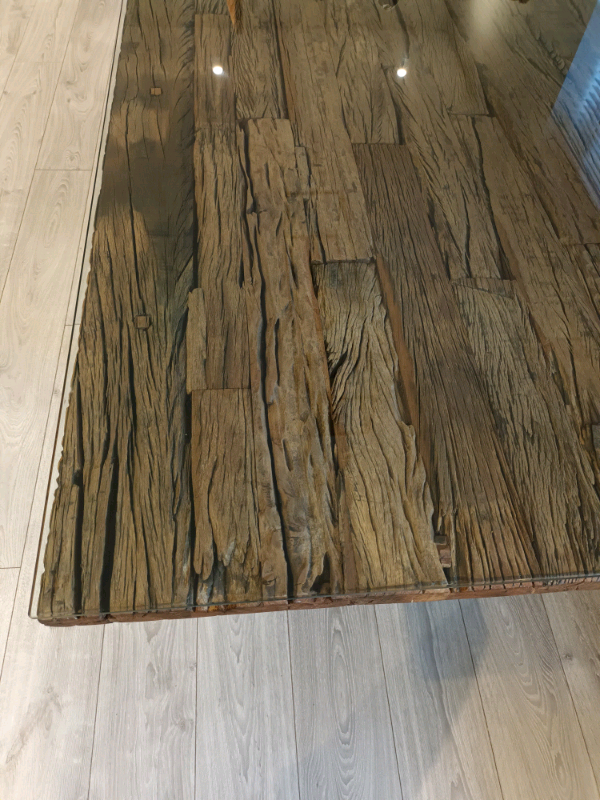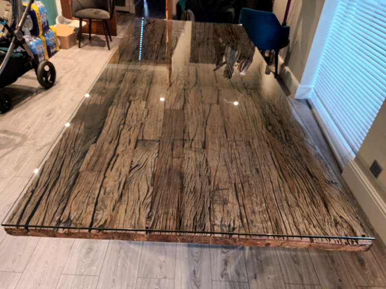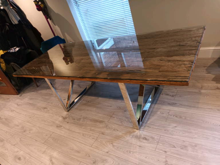 2.4m recycled wood, glass top dining table with chrome legs. Seats upto 8. Very good condition. £700 o.n.o