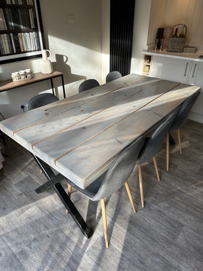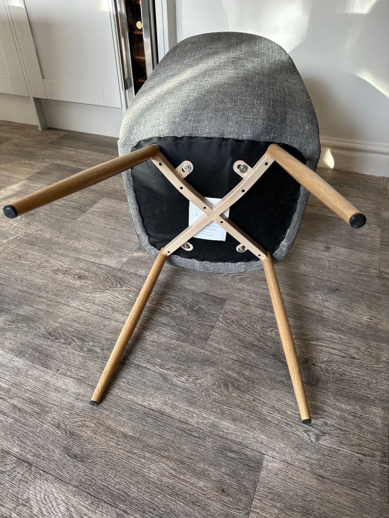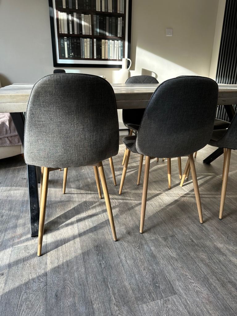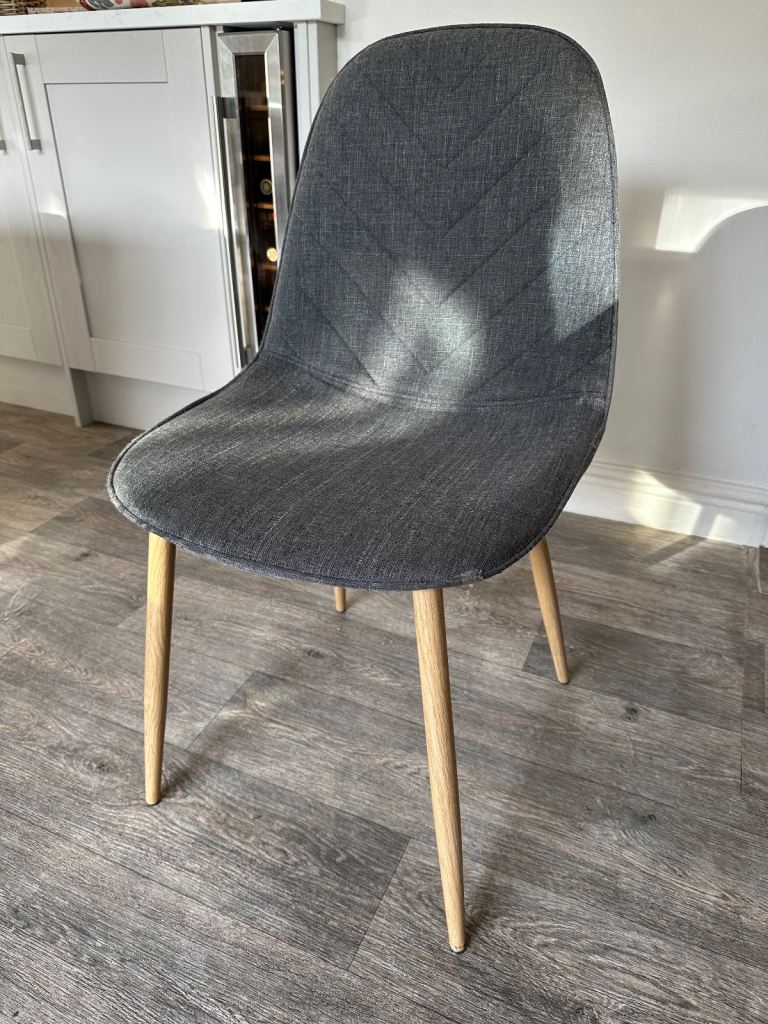 In good condition, 4 grey fabric chairs with durable legs. Not a mark on them. From a smoke free, clean house.