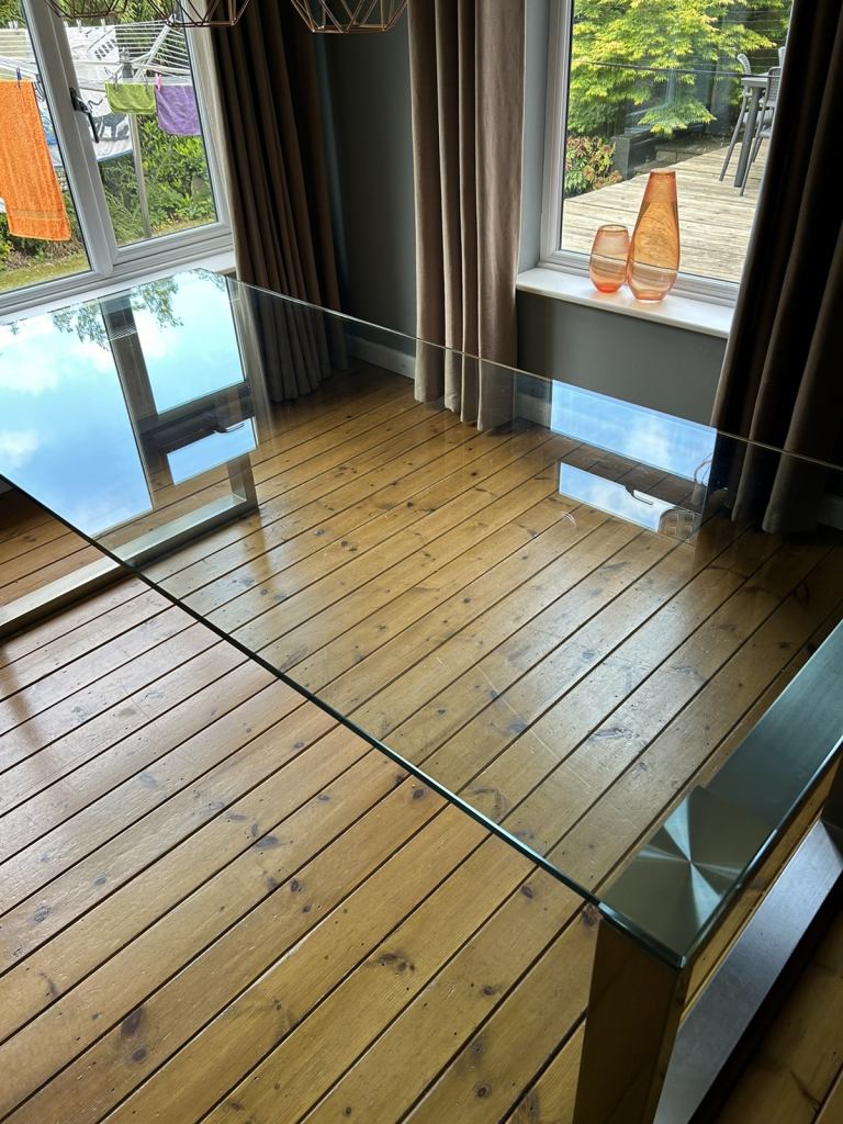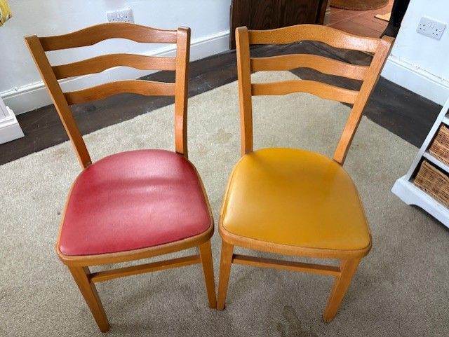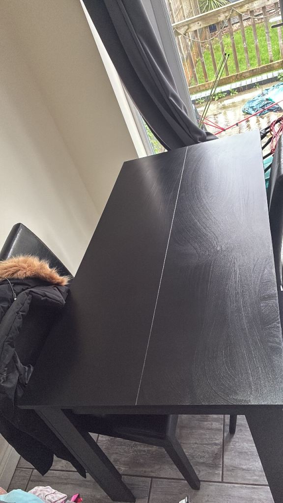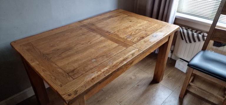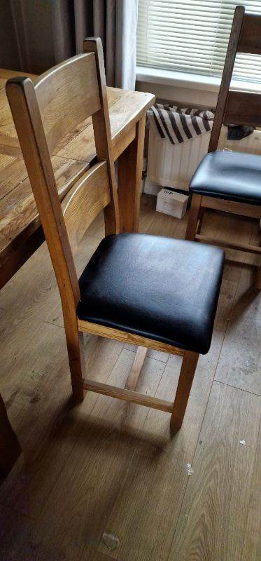 Solid American oak dining table with 4 chairs black leather cushions. Dining table can extend.