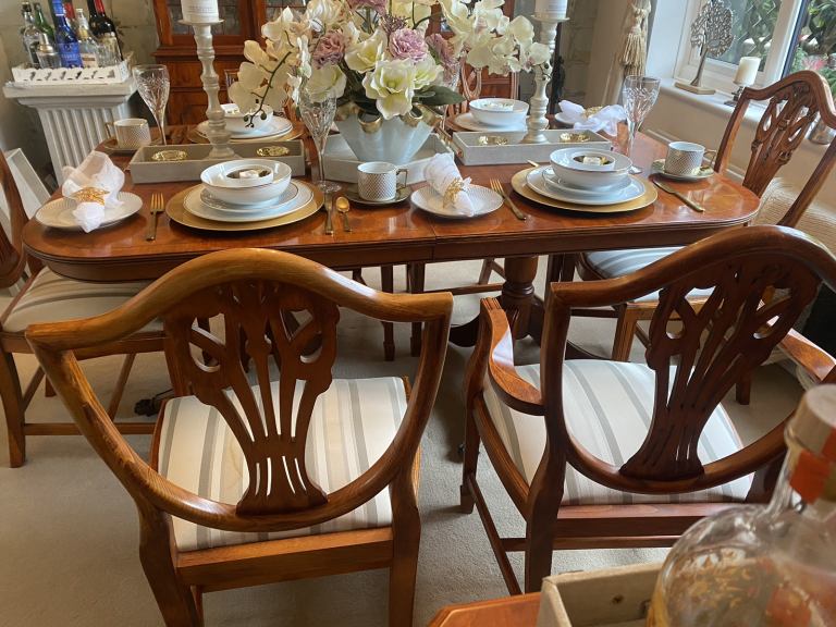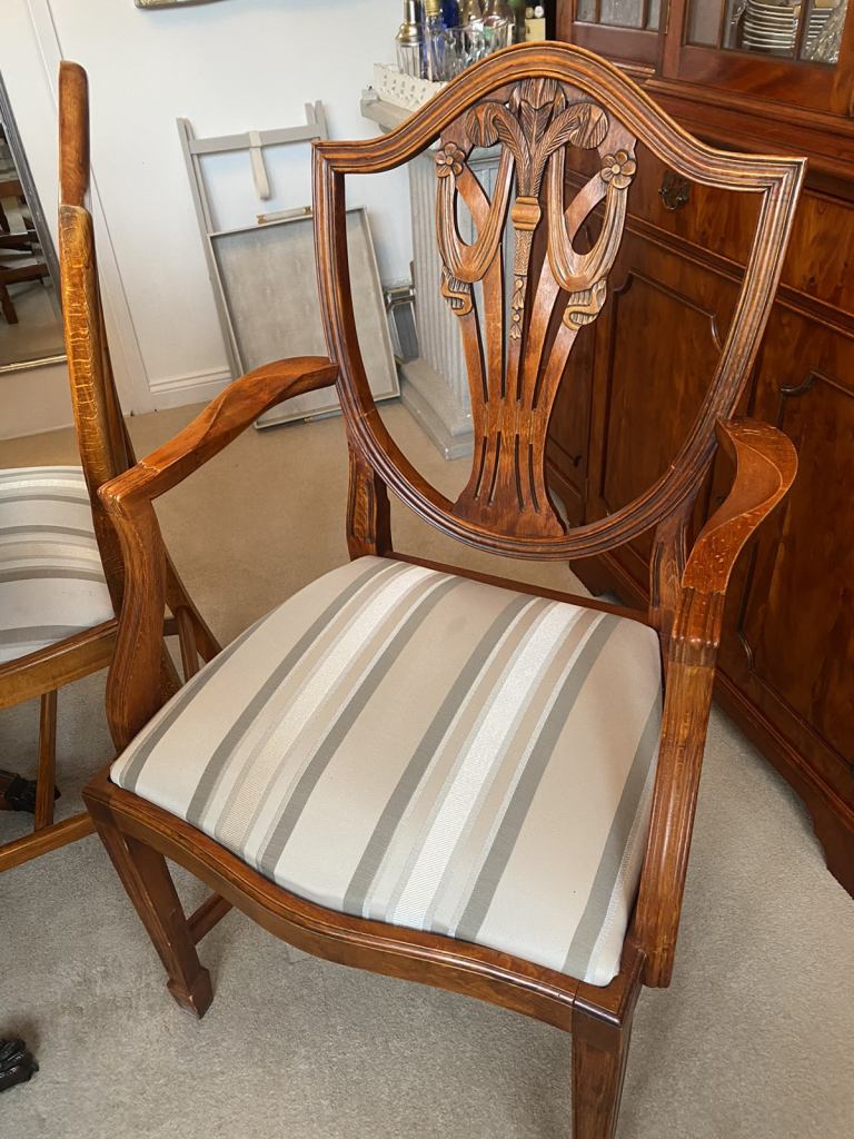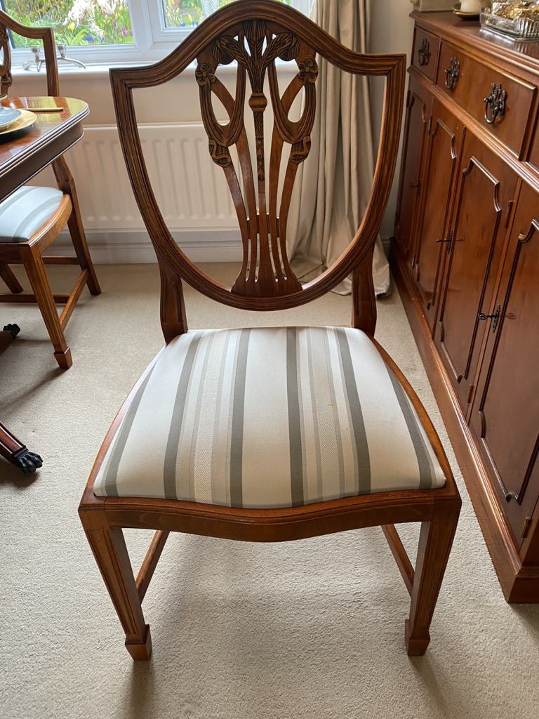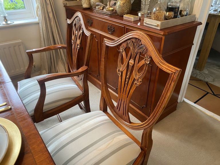 Barker and Stonehouse dining room chairs Excellent condition 6 solid wood dining room chairs. Consists of two carver chairs (with arms) and 4 chairs, all upholstered in a pale striped fabric ( easy to recover if required).Heavy and robust in a light yew wood.