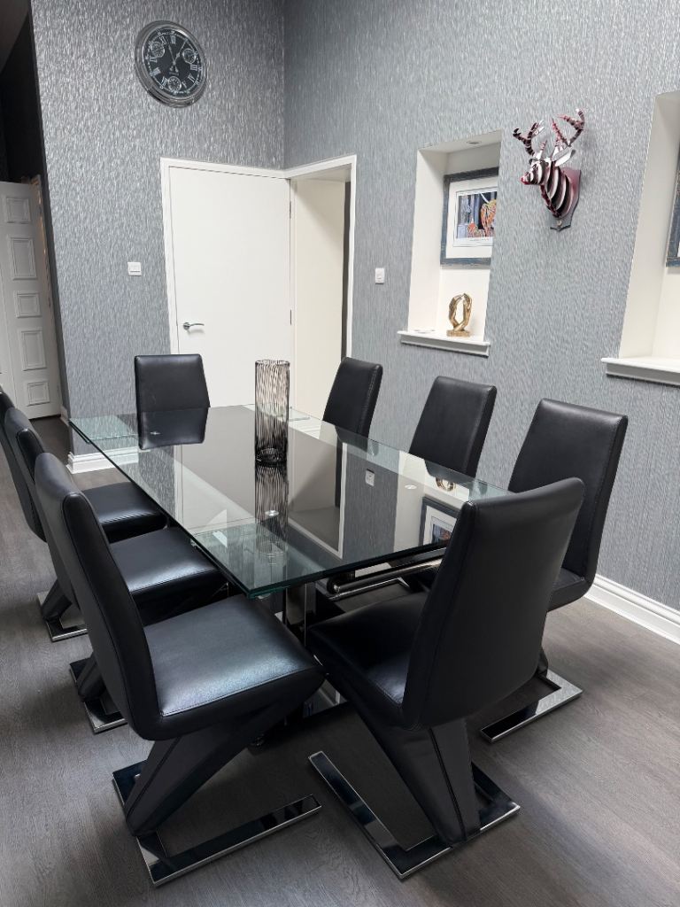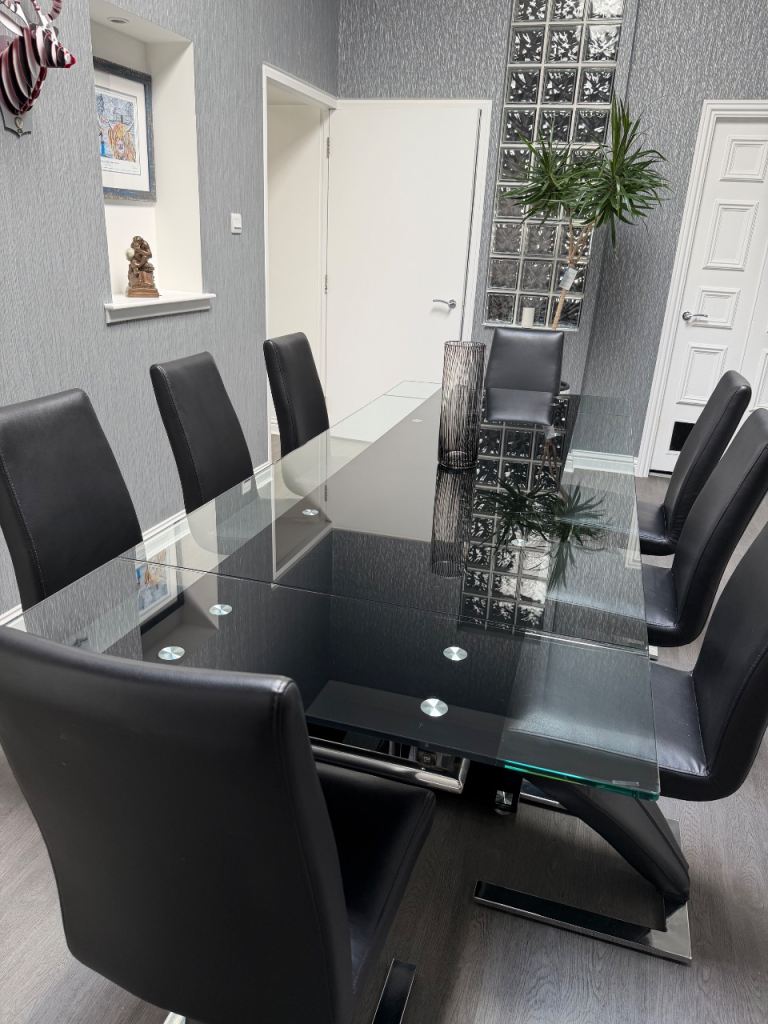 Extending Black & Clear Glass Dining Room Table & 8 Faux Leather chairs. Collection needs to be arranged.