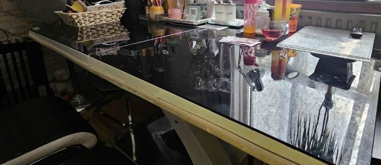 Black glass top extendable dining table. White foam child bump safe strips as seen on images can be pulled off easily.