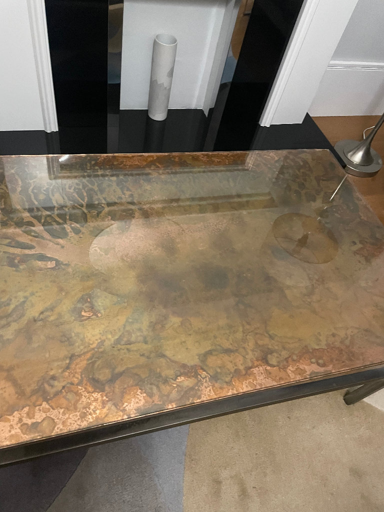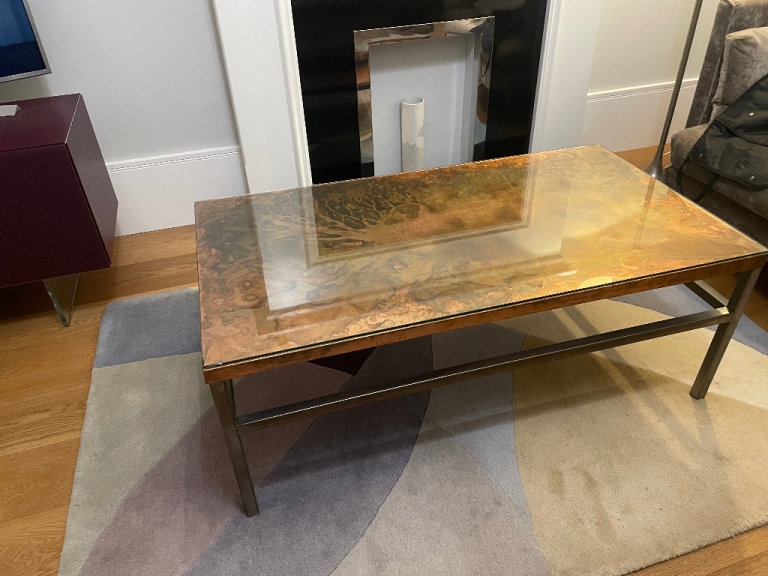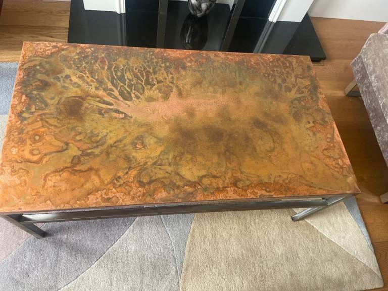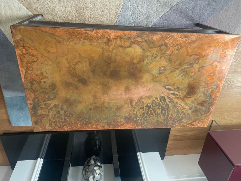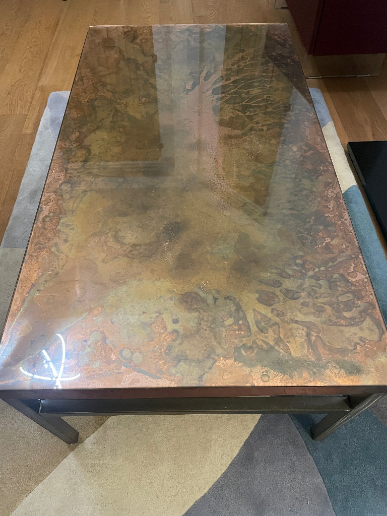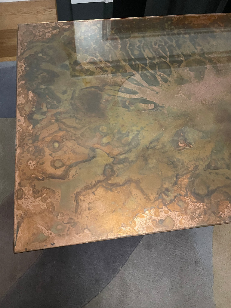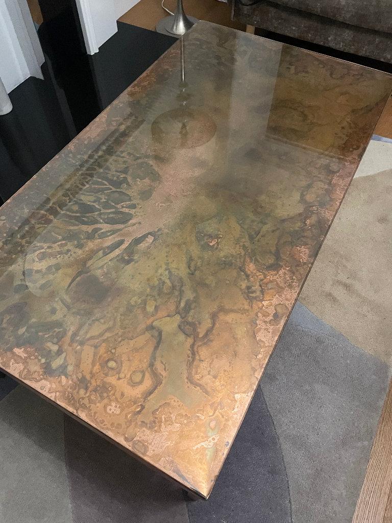 Custom made coffee table with patterned copper top and stainless steel frame.