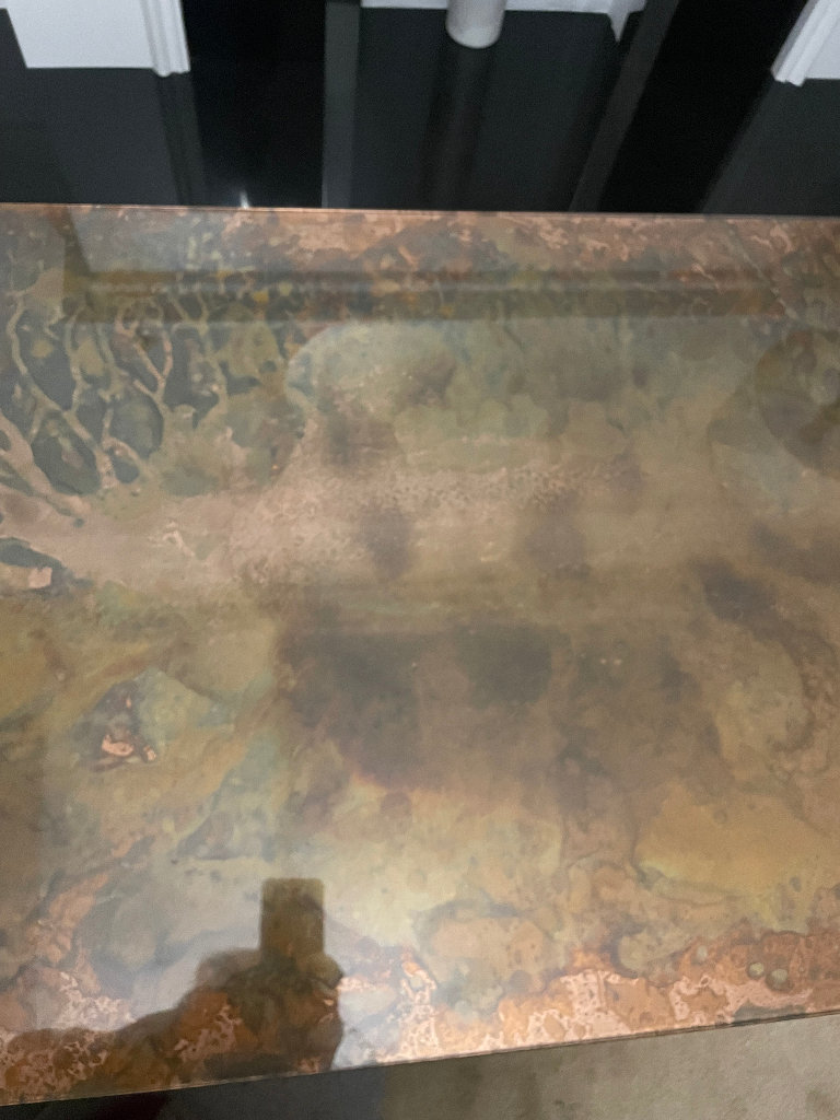 The glass top is optional - this is slightly chipped at the corners but protects the copper - buyer to decide if they want to take the glass top but looks good with out without glass top.
