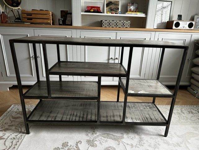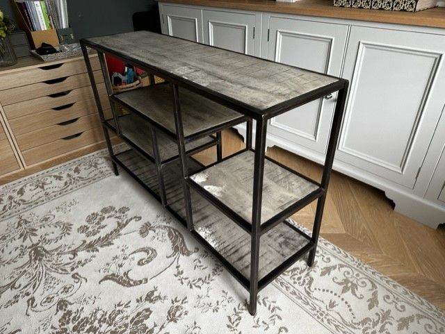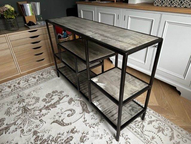 This industrial style console table is a stunning addition to any home decor. With a wood tabletop and metal frame, this rectangular shaped piece measures 120 cm in length, 35 cm in width and stands at a height of 80 cm. The grey colour of the table complements its industrial style and would suit any interior design scheme. Its versatile nature makes it perfect for use in any room, from the living room to the hallway, as a functional item or statement piece.