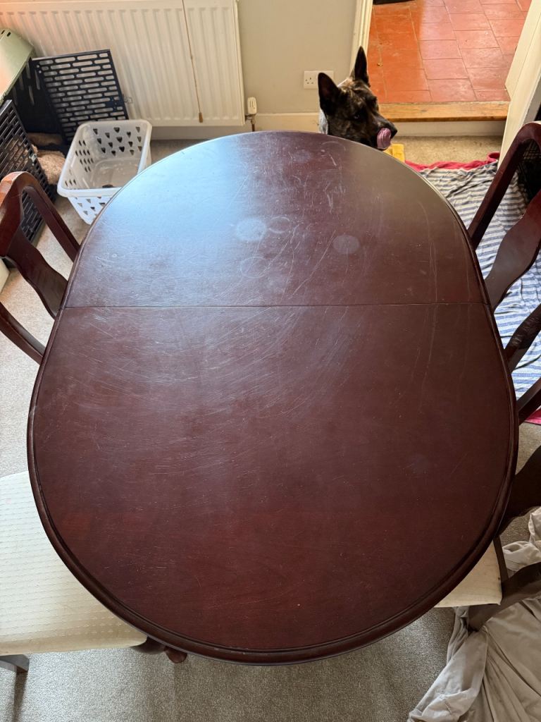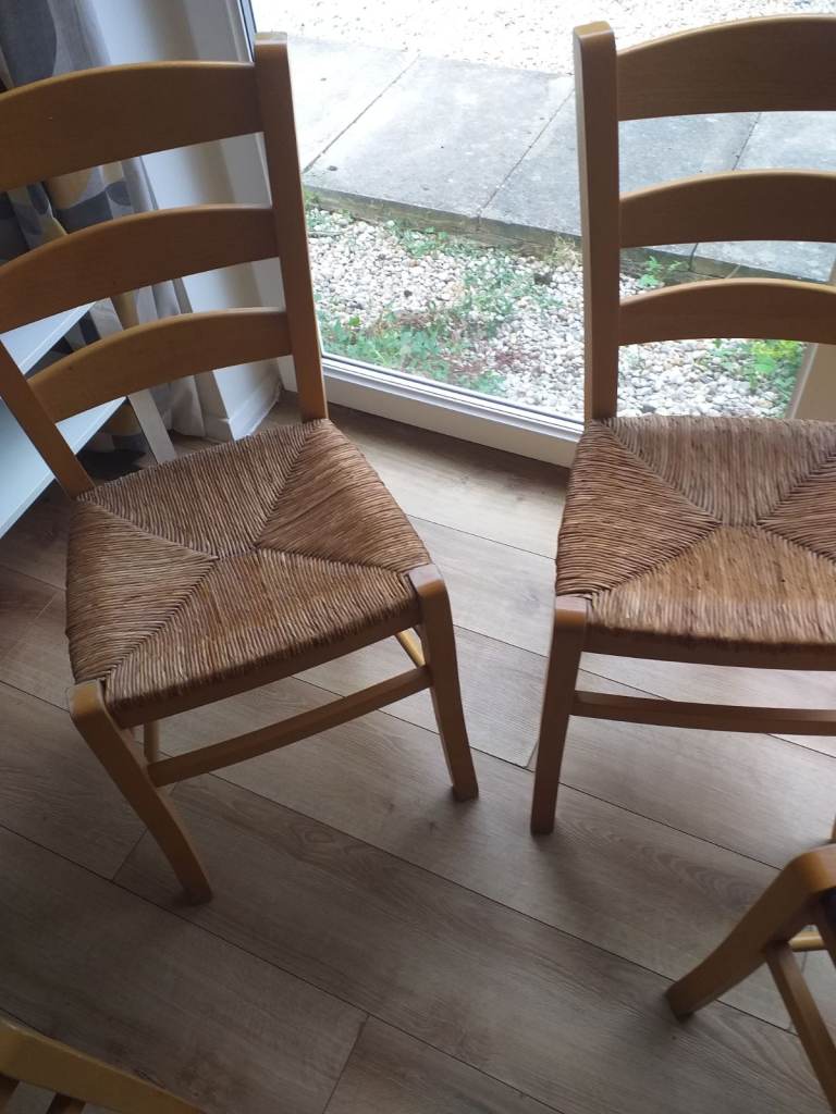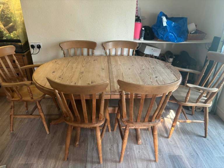 6 Dining chairs for sale pine frame two upholstered 4 original good condition £ 10 for the 6 cash on collection.