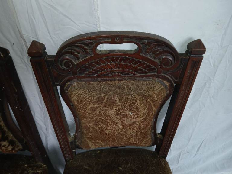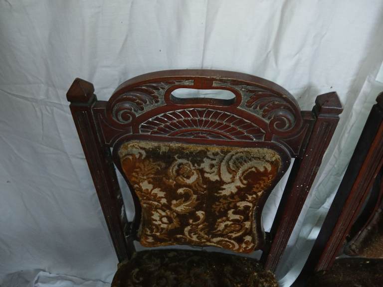 A matching pair of dining chairs. Would need to be recovered but in good condition.