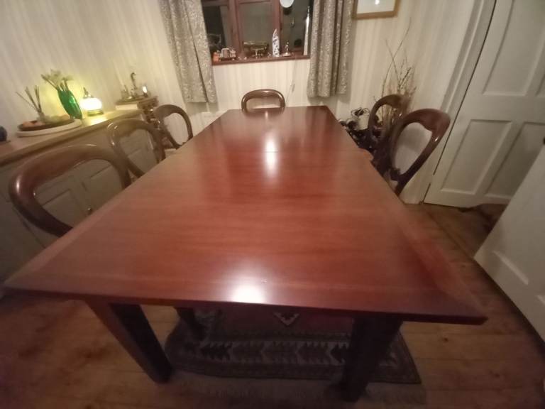 Multi York, extendable dining room table and six chairs. I believe the wood is mahogany. Apart from a small marking on one of the leaves the table is in excellent condition. It has been covered with a table cloth since it was purchased . The chairs have balloon backs and given at no extra cost. Table dimensions: L166cm W100cm H76cm without leaf. With leaf L214 cm