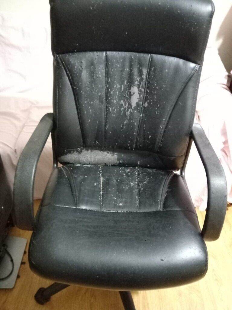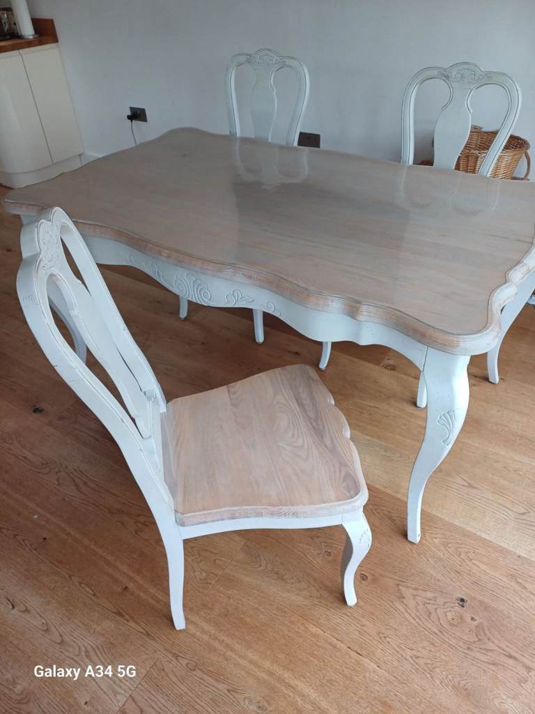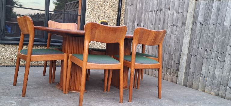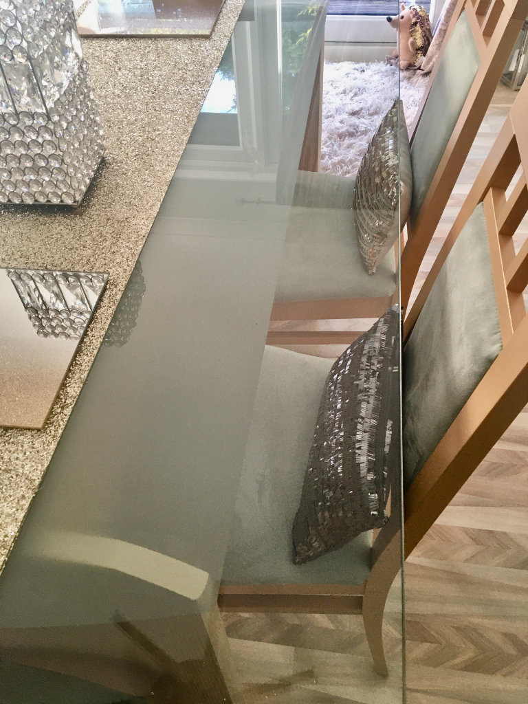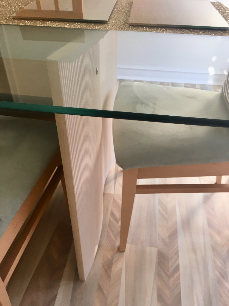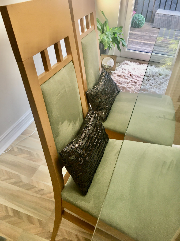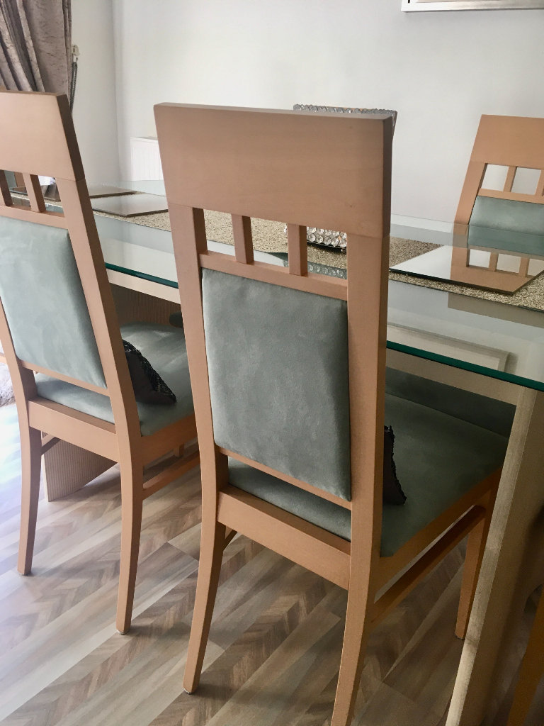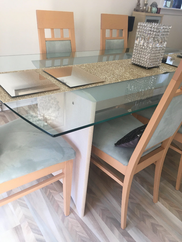Large partly frosted Glass Top Dining Table. shaped wood base: 6 microsuede aqua green maple Mackintosh style high back chairs: Hardly used, all very good condition:Cost new £1400 scotch guarded etc, smoke & pet free home.