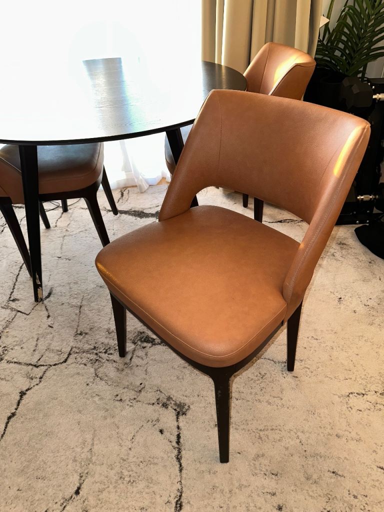 The three chairs are upholstered in a tan leather-like material, offering a comfortable seat.