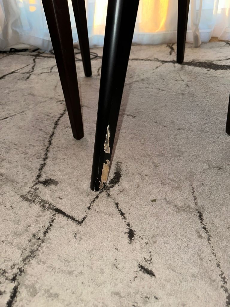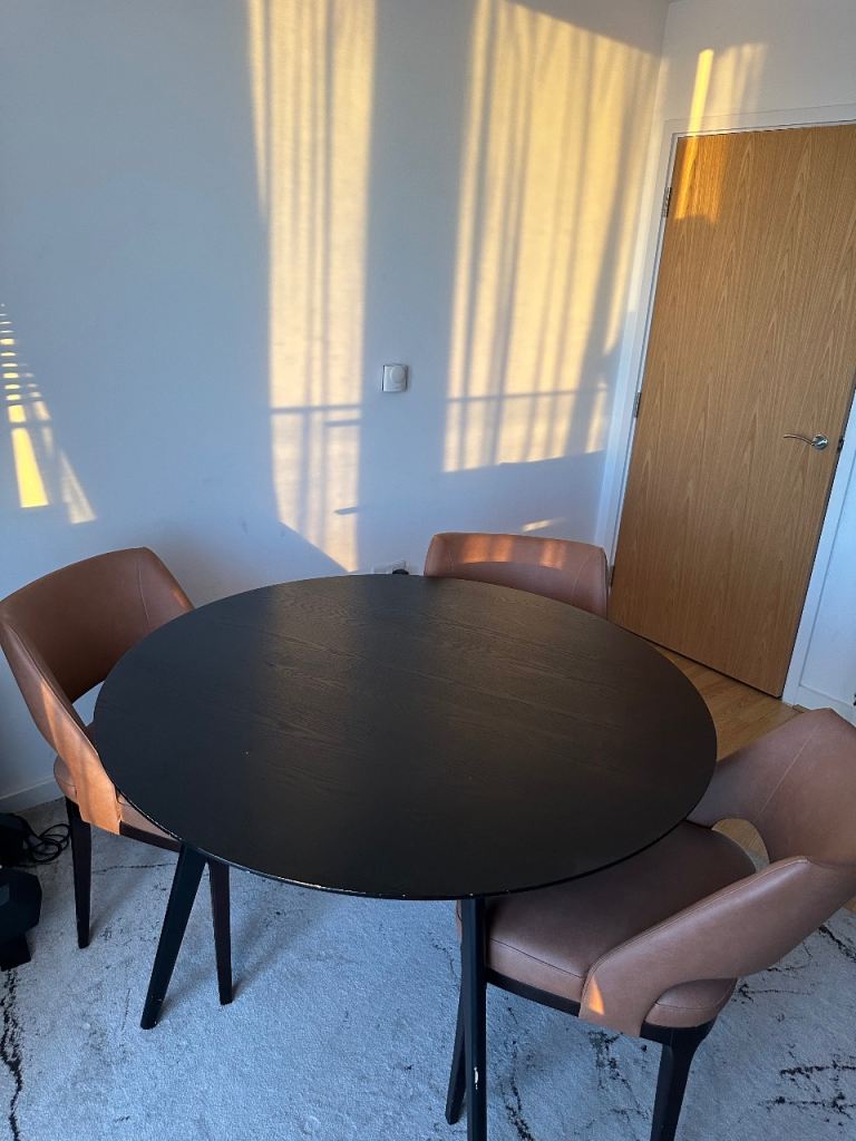 Lovely dining table with a dark wooden top and matching chairs.