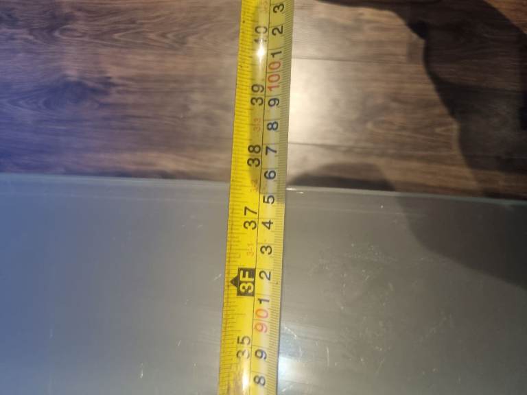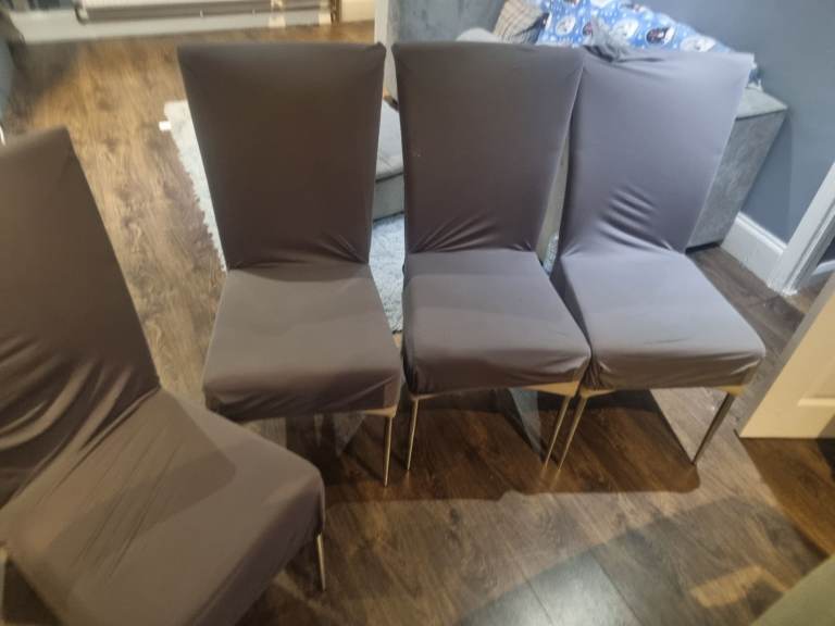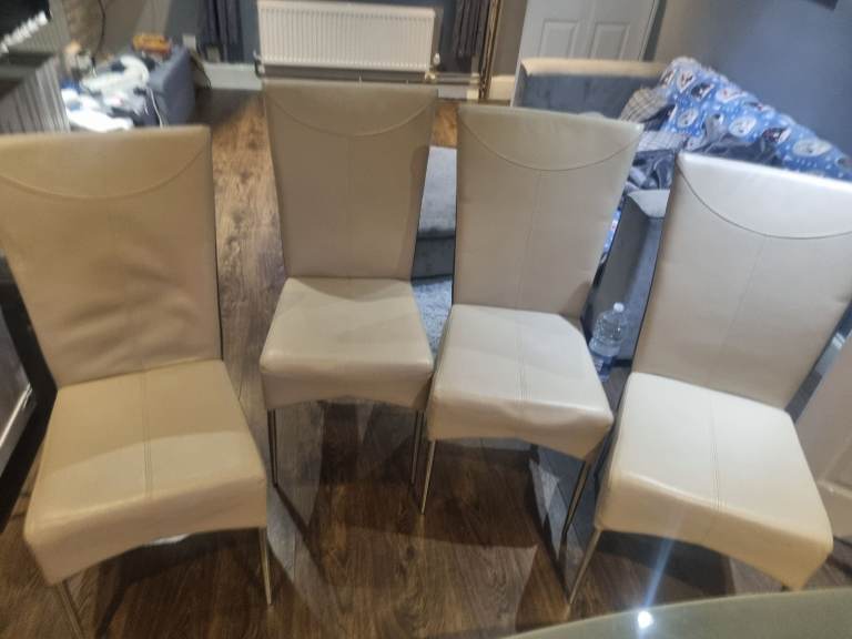 2 shelf glass dining table and 4 chairs. Heavy duty glass. The 4 chairs are cream with some marks. All come with washable grey covers. The table is 95cm by 150cm as seen in the picture . Also willing to sell just the table