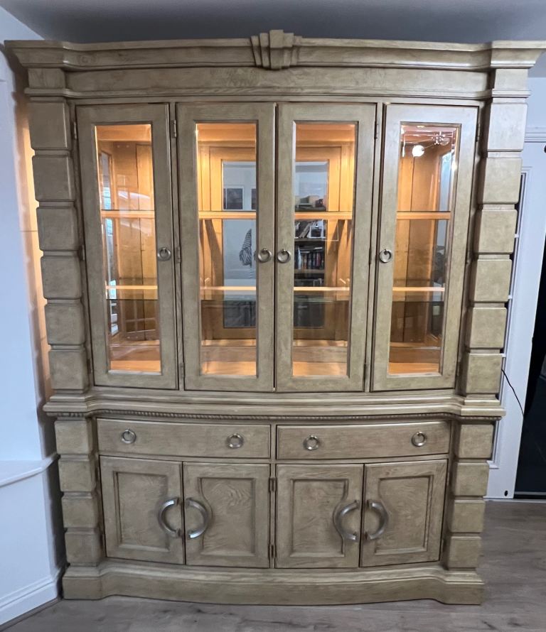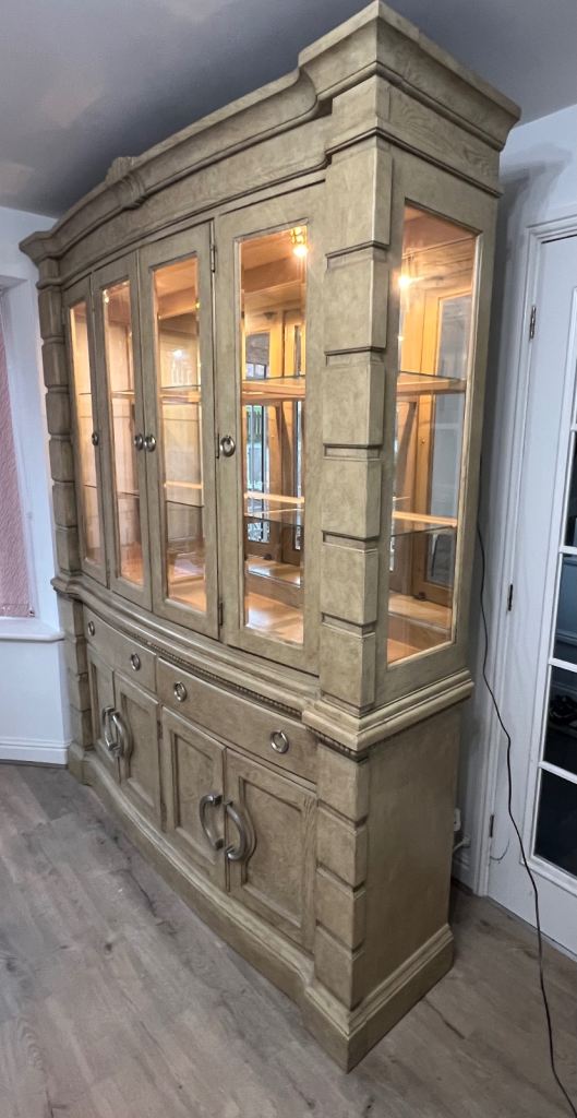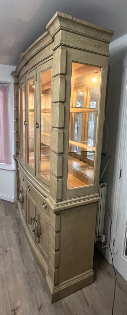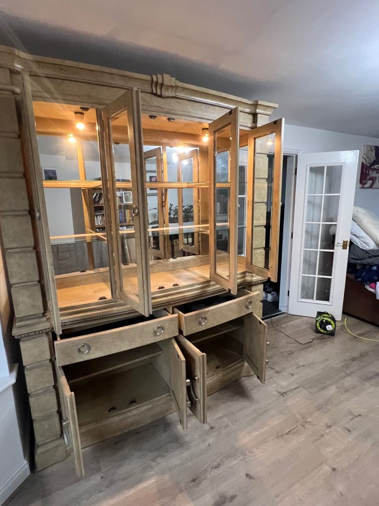 This set includes a dining table, chairs (2 carvers and six standard) and a sideboard/display cabinet (with 2 lights). A few marks on the tabletop but all in generally in good condition.