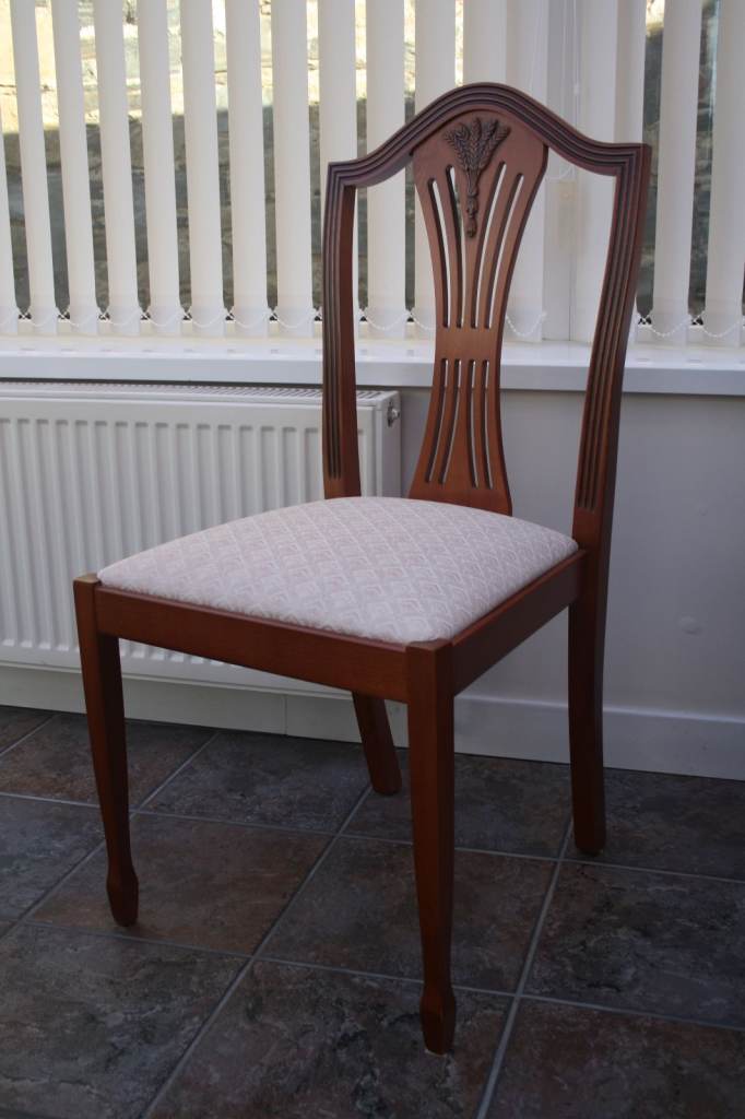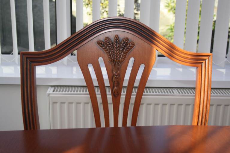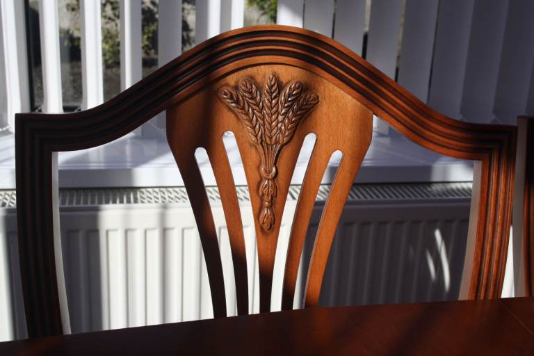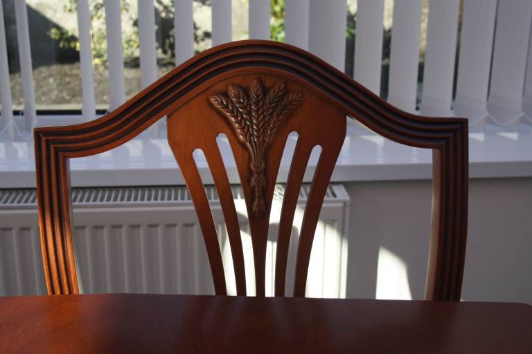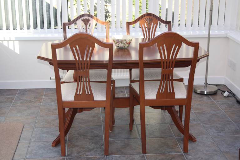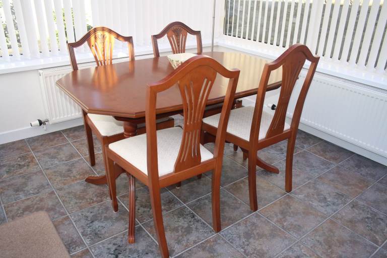 Classic Sherwood Dining Table and Chair Set - Cherry Wood colour & 4 matching Chairs. Sculpted legs. Extendable table-top. Seats four people or up to eight people comfortably when extended. Wheat-sheaf feature on top of chairs. Chair cushions - scallop pattern. The table is 54” (L) or 70” (L) fully extended x 35” (W) x 29” (H). Excellent condition. Cash and collect only.