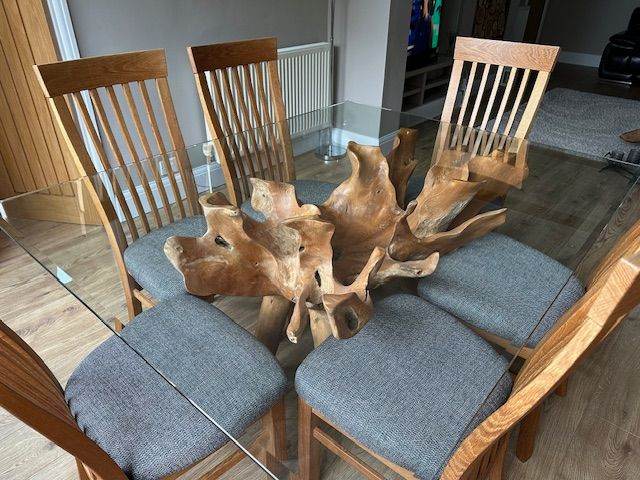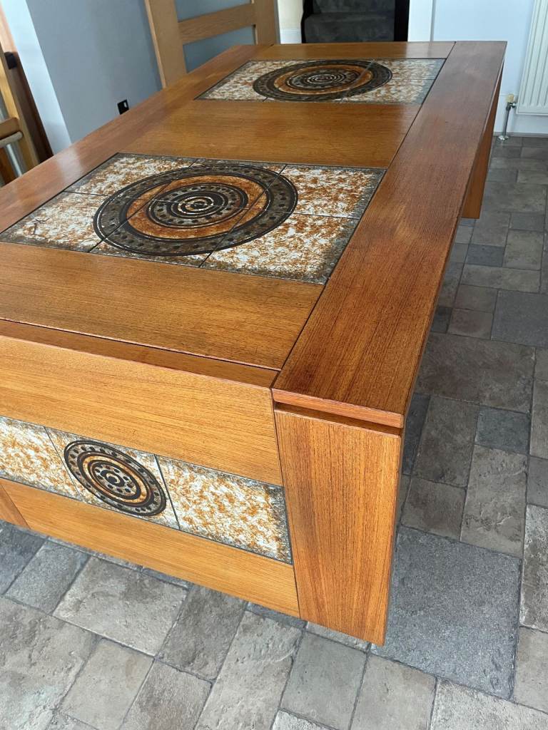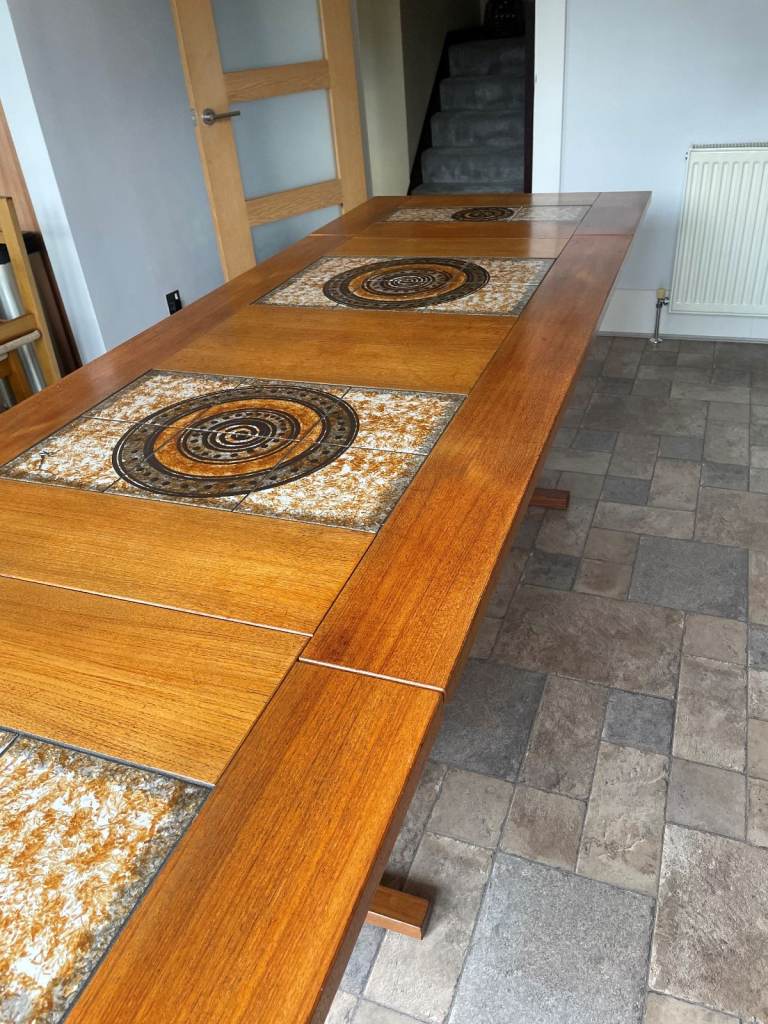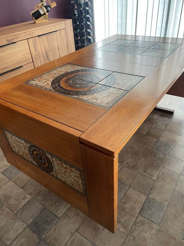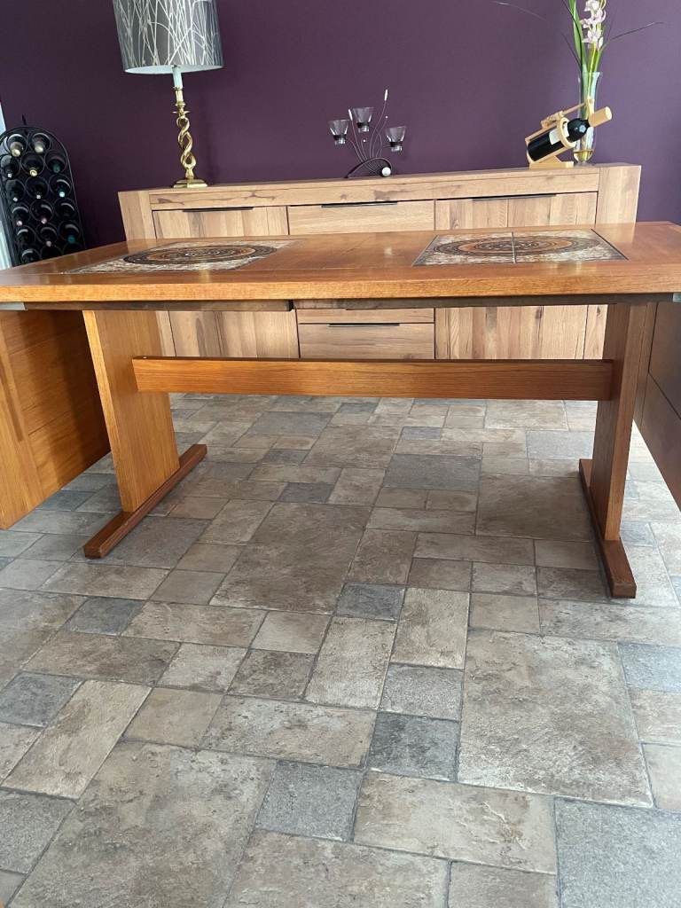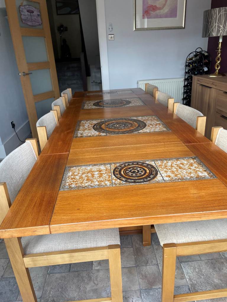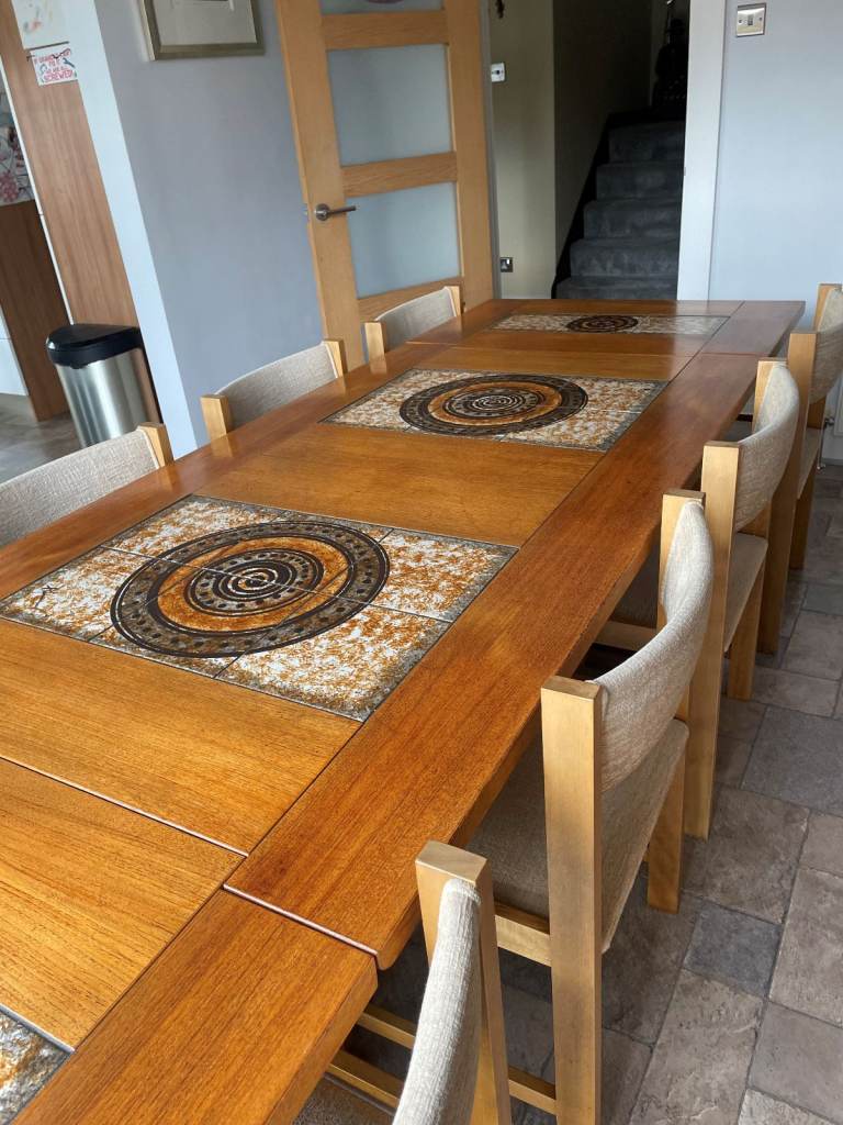 Beautiful part tiled 8 seater Dining Table. Dansk Design table in superb condition virtually unmarked, chairs not included in sale. Has 2 easy fold down ends. Size (extended) 106 x 36 x 28 inches high, 64 inches long with the 2 sides down (each 21 inches). Legs and fold down ends can be removed for easy transportation. A real genuine bargain. South Woodham Ferrers / Maldon area.