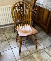 Round dining table, pine, 122cm x 78cm. Pedestal base. Comes with three chairs. Buyer collects