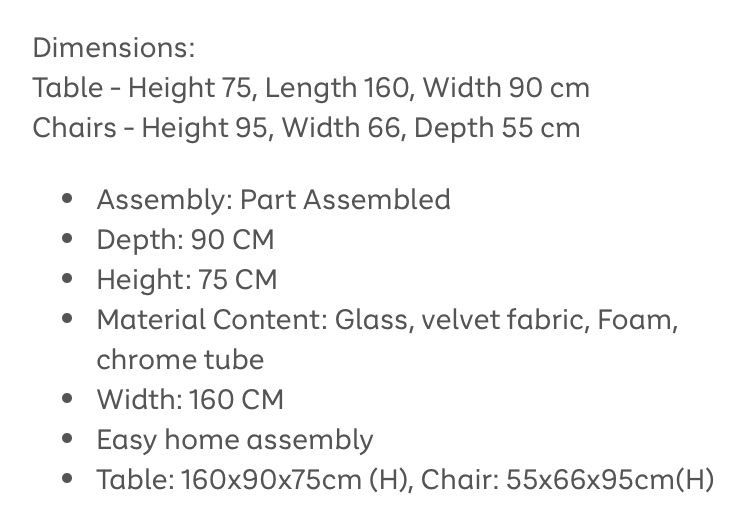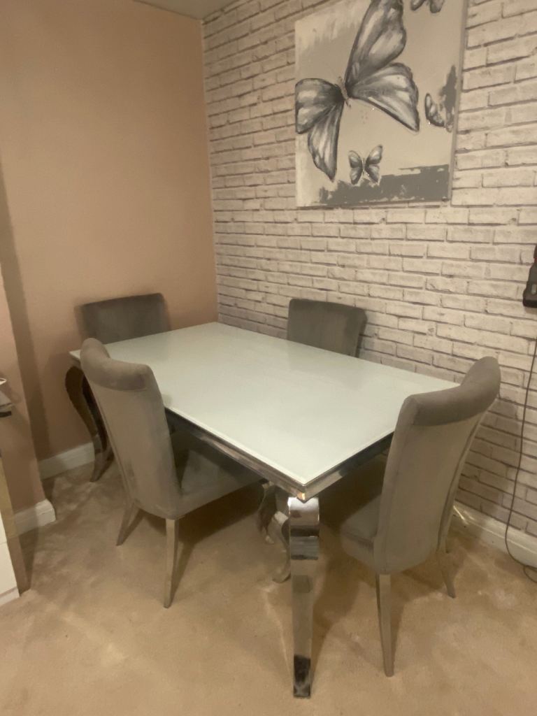 6 seater table with Chrome frame and legs with extra thick tempered glass with a white layer top. I have 2 extra chairs but not in the picture.