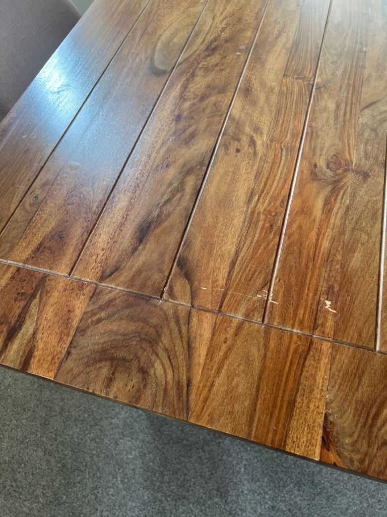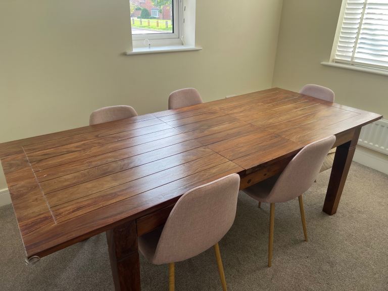 Stunning elegant and heavy dining table made of sleeper wood. Many happy times around this table. It has a middle leaf that extends the table. Damage mark on short edge (pictured) which can be covered using a table runner.