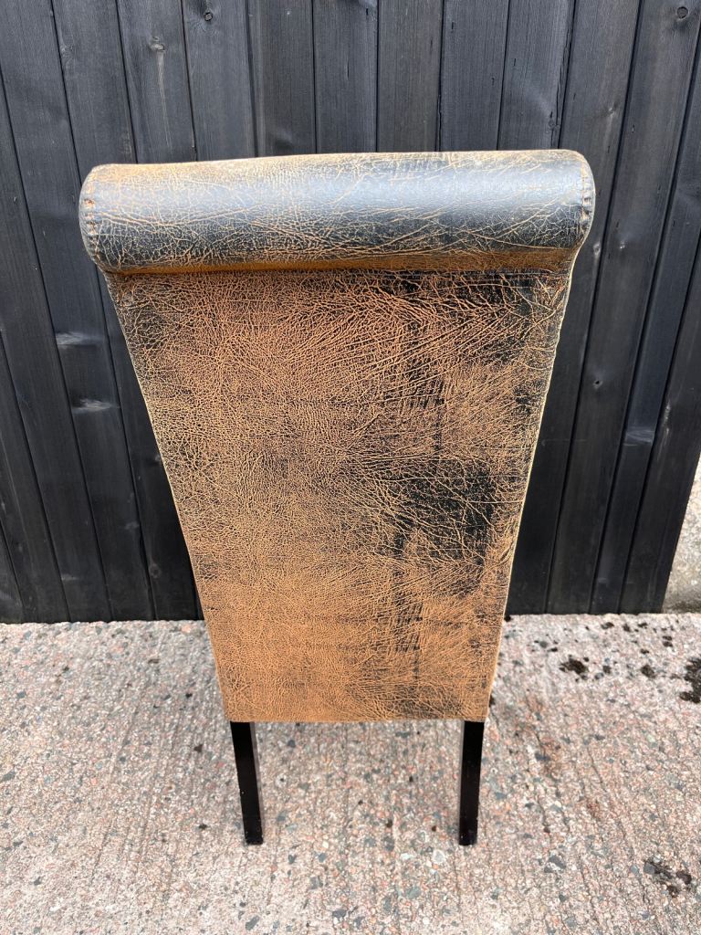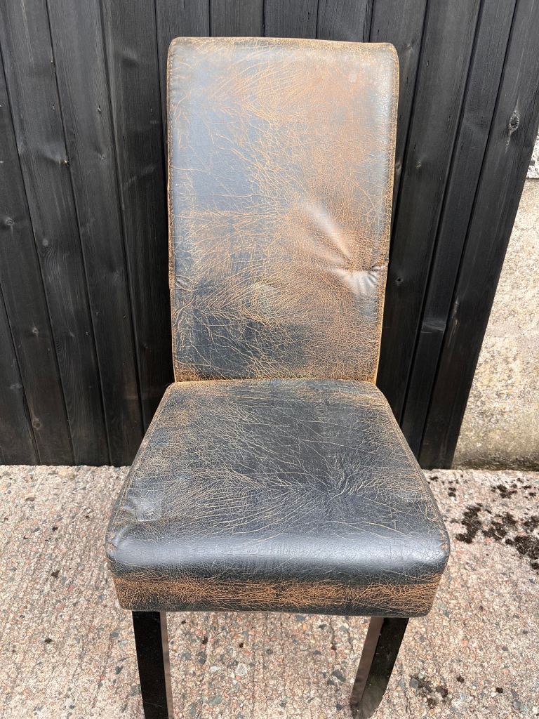 Only 6 left …. Lovely dining chairs in a brown faux leather ( can sell separately)