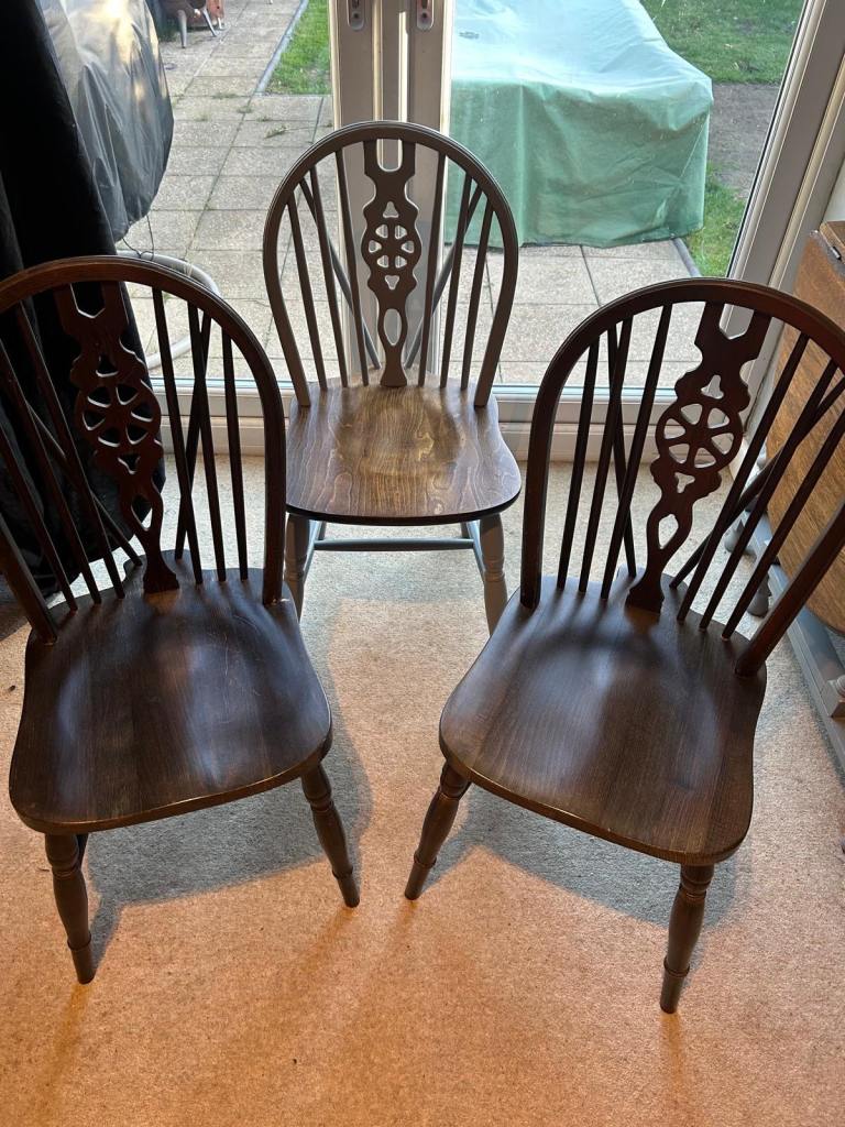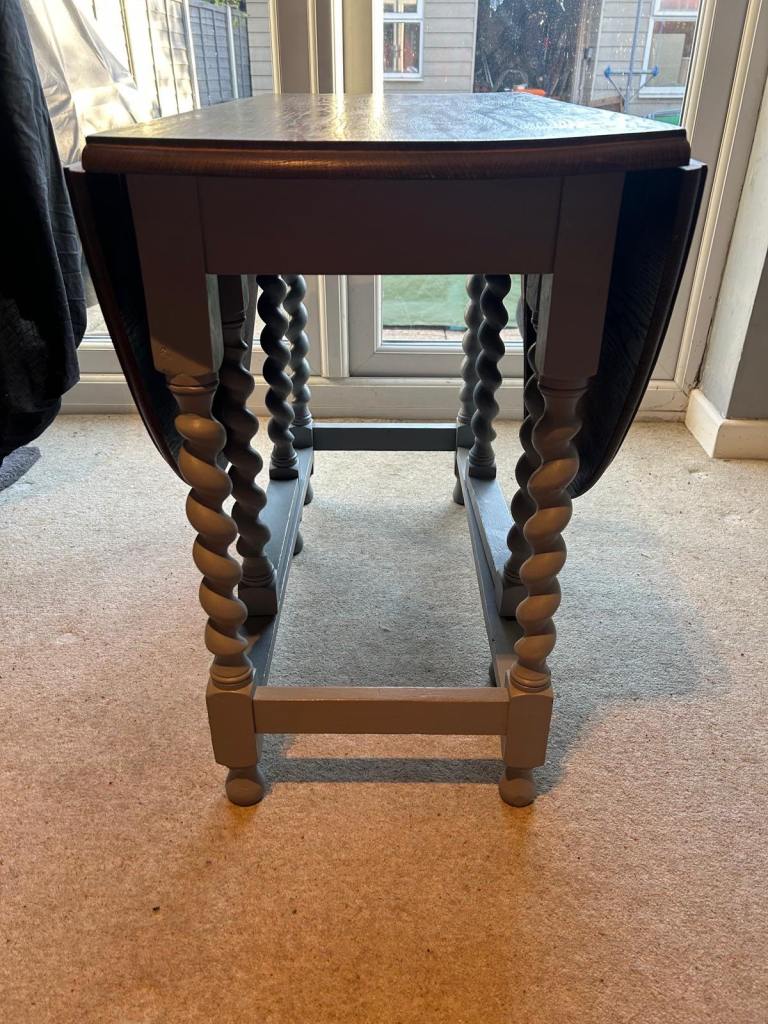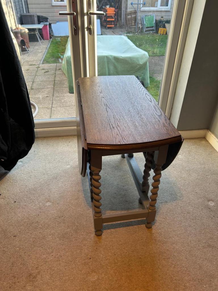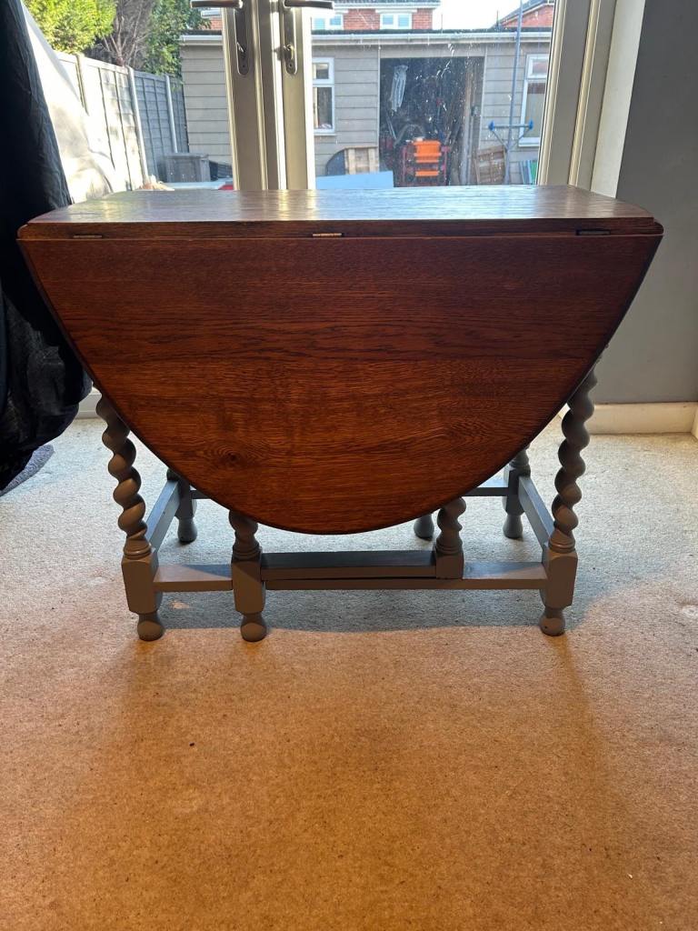 Table has been re-furbished with legs painted grey as has one of the chairs. Other 2 chairs are original wood effect.