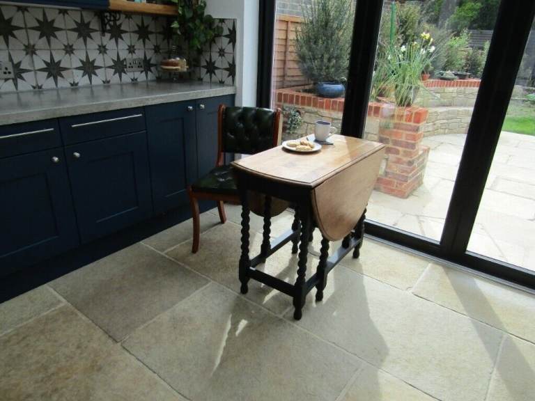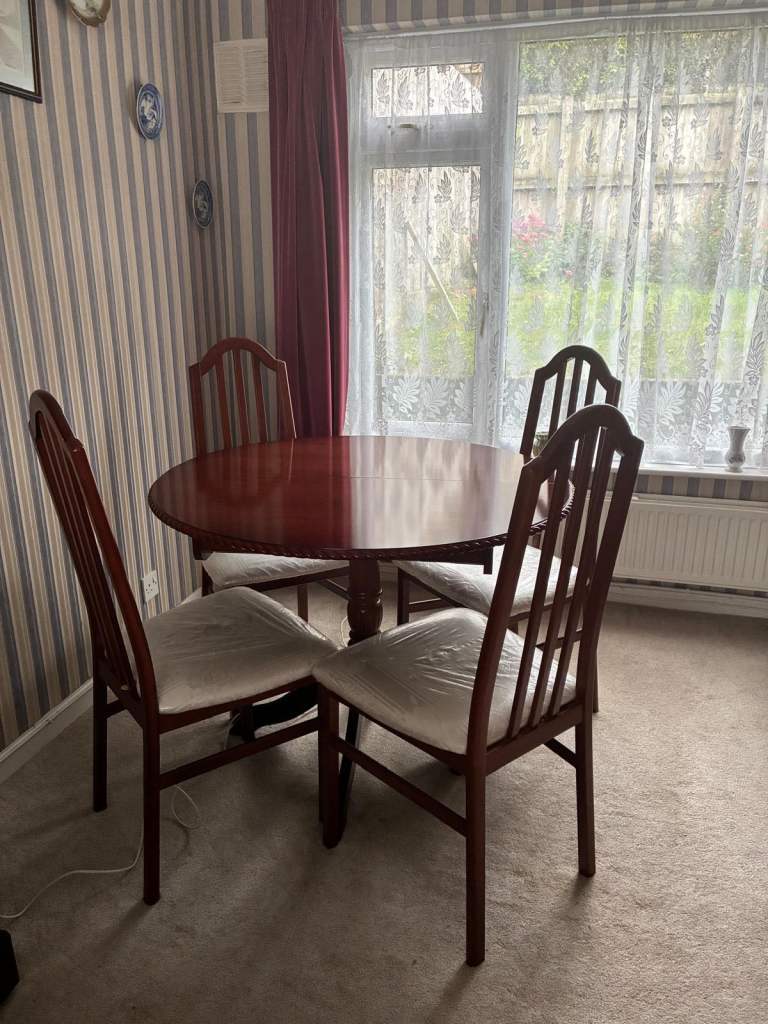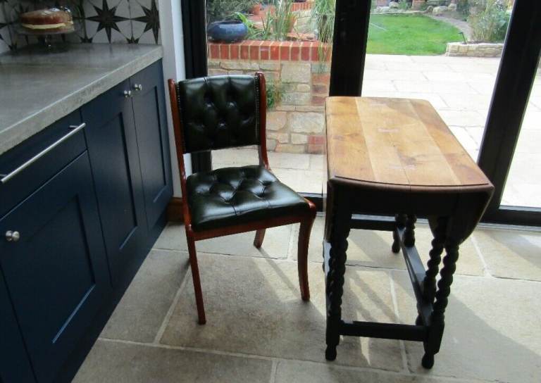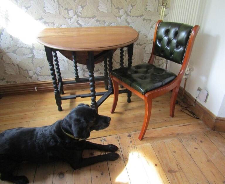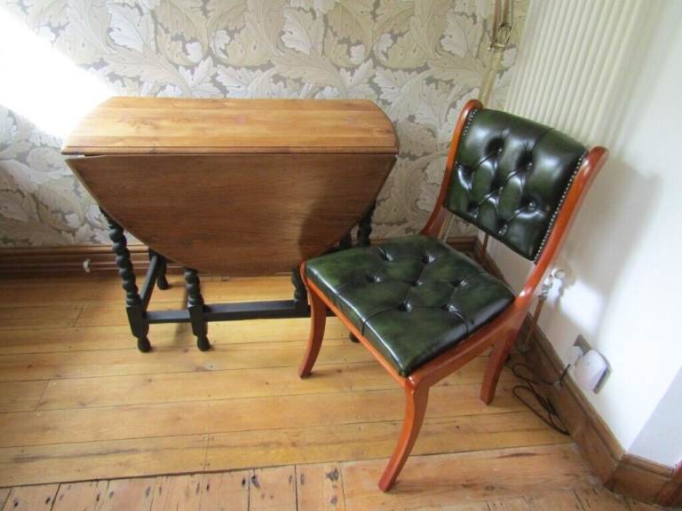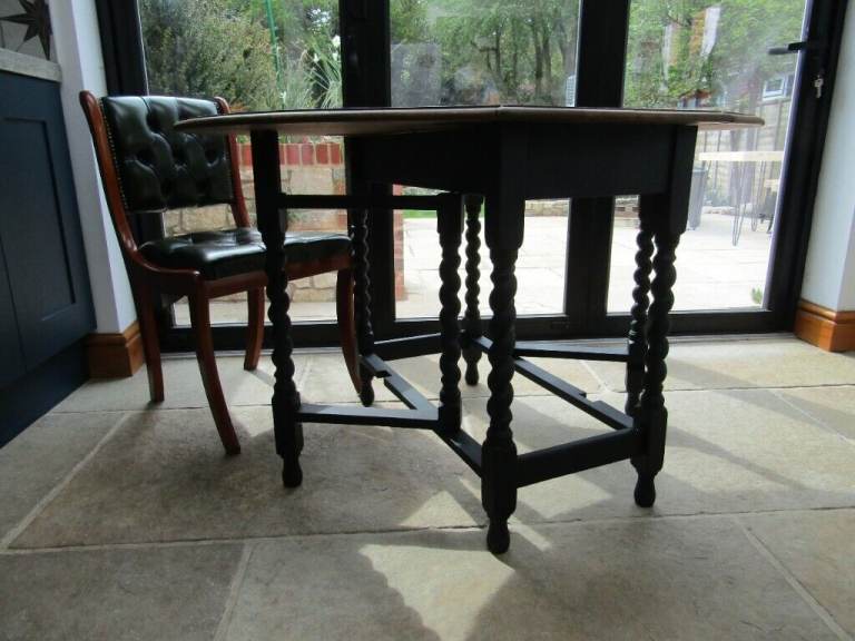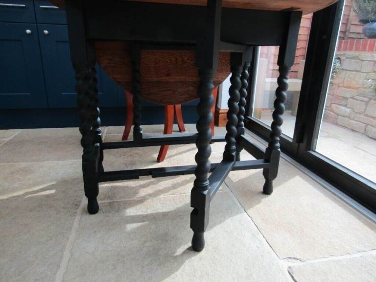 Twin leaf oval Gate leg table with barley twist legs and new bowtie inlays on central section. Top is waxed and polished, legs and subframe are painted matt black. Table measures 745mm high, 910mm long and 460mm wide when collapsed. Total width with both leaves up is 1260mm. Chair is for display only and not included in the listing.