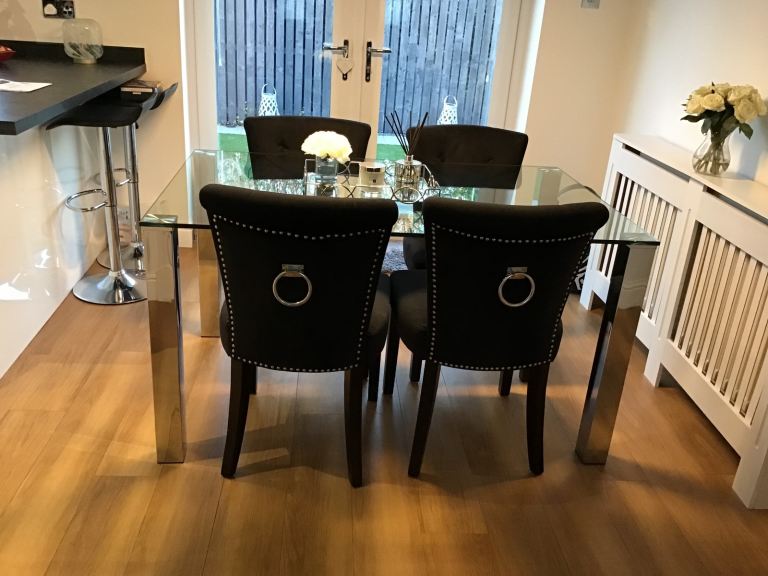 Next Glass Dining Table and 4 Black Velvet Chairs from My furniture. Chairs Still on sale for £99 each. Excellent condition. Hardly used. Smoke and pet free home