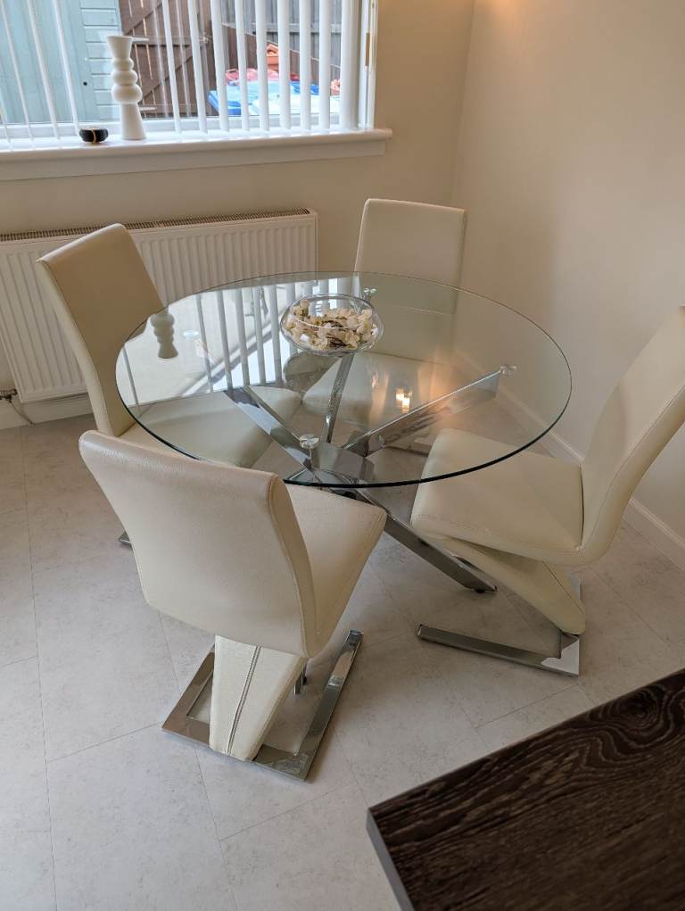 Posting for 4+ yearsGlass kitchen table with 4 cream leather chairs