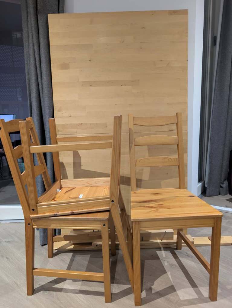IKEA Bjursta expandable table. Already disassembled for easy transport. 3 chairs come with it as well. A few minor marks which can probable come off with a deep clean effort.