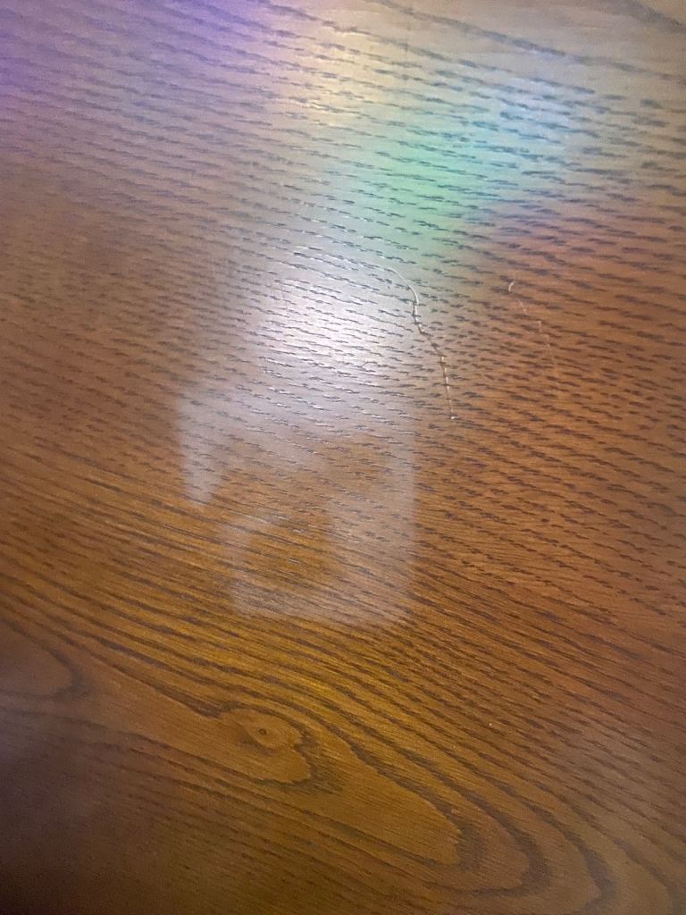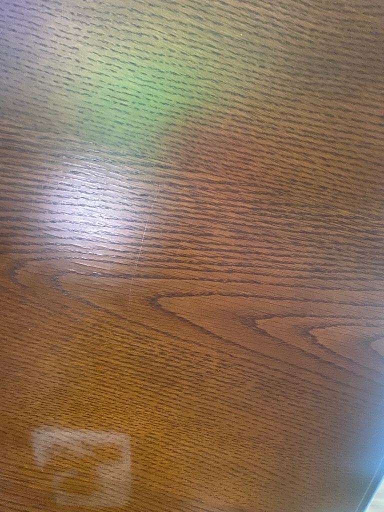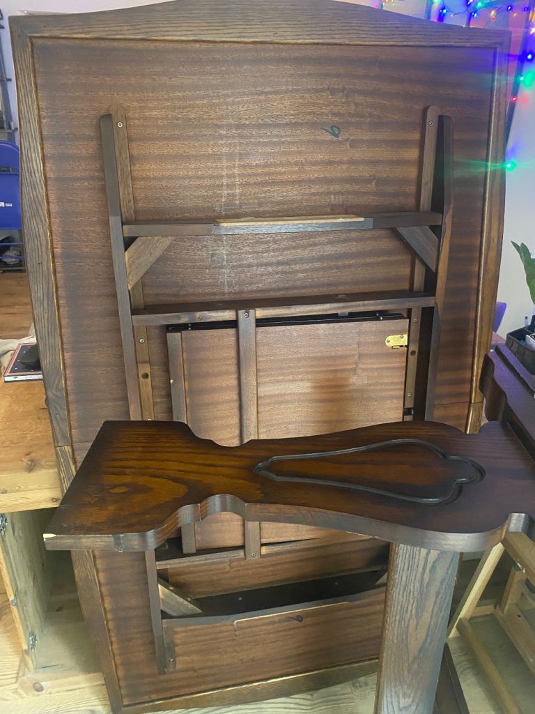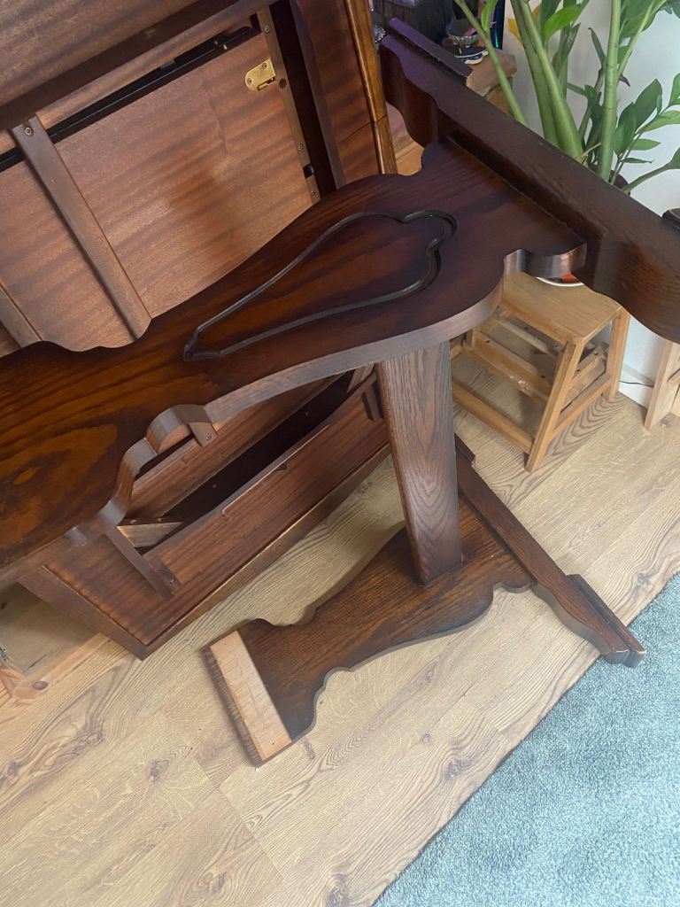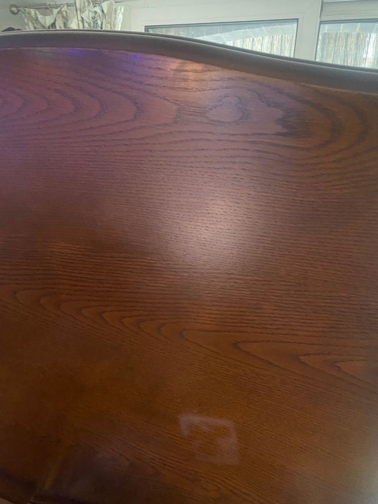 Good, dark, solid wood. One large scratch and one water mark. I’ve tried to capture them in the photos! Otherwise, in good condition.