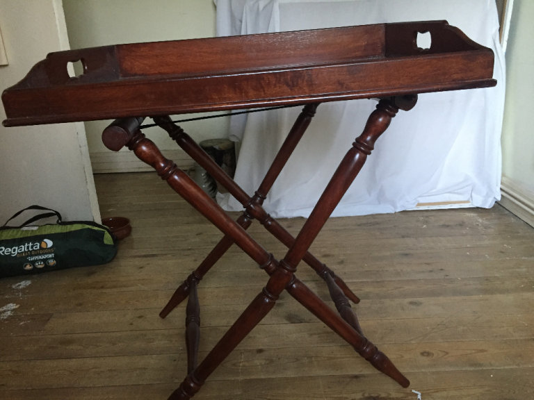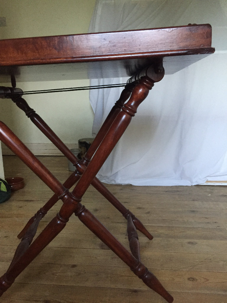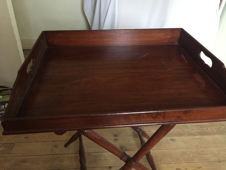 Large Beautiful mahogany dining tray. Needs a little bit of fixing on the back as seen in photos. But very minor. Overall in excellent condition and can still be used. Made of beautiful mahogany wood. One of the legs is slightly bent again needs a little fixing there, but this can be easily fixed. A very good quality piece of furniture. Bought at an expensive price originally.