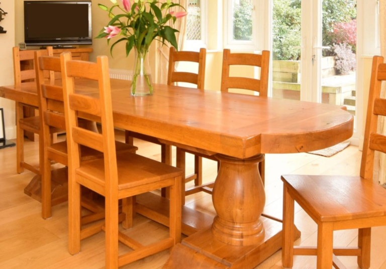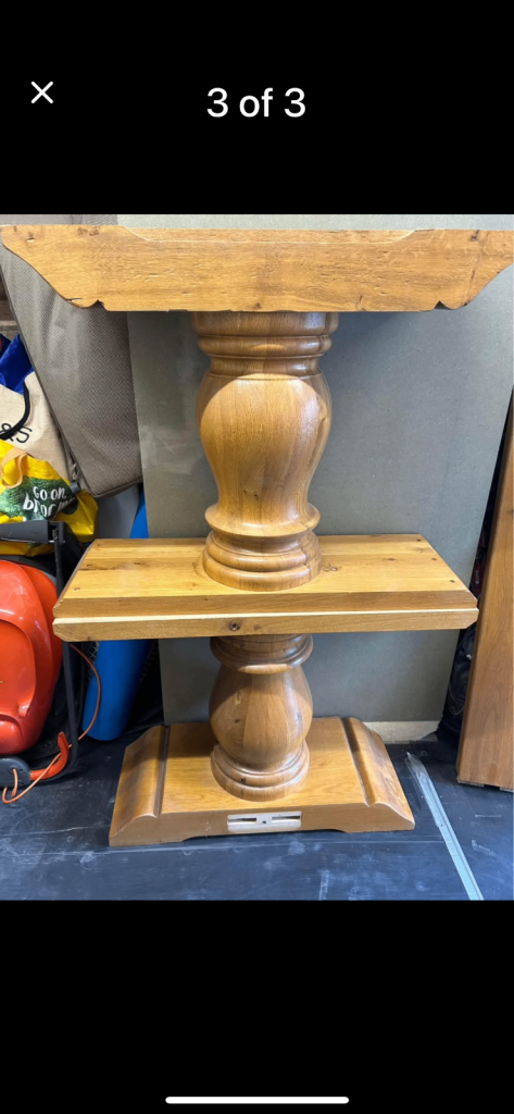 Needs some tlc. The solid oak table sits on two large pedestals need restoring but a lovely family table.