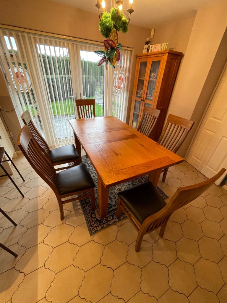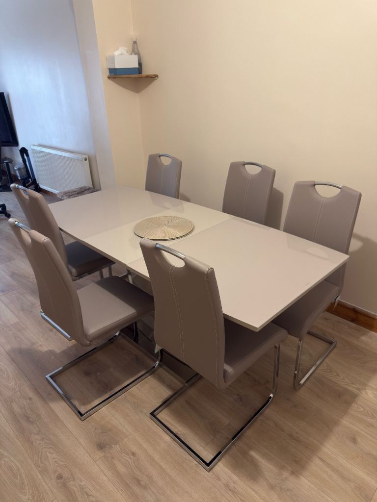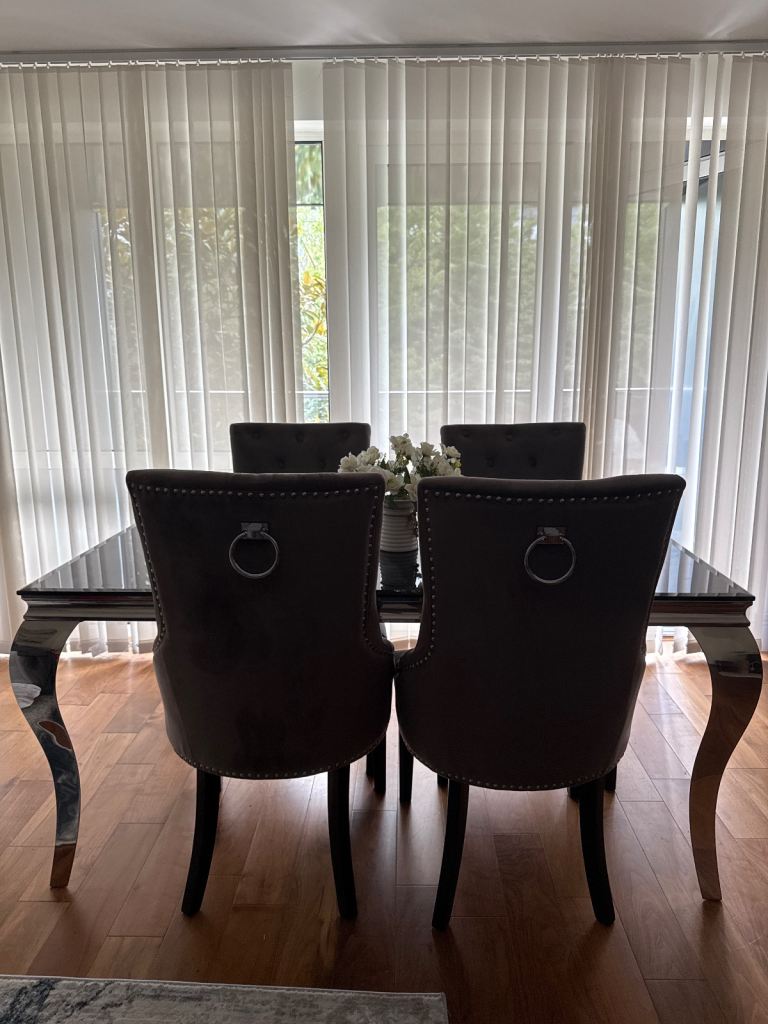Stunning dining table paired with 4 grey velvet upholstered chairs. Elegant studded detail with chrome ring backs for a designer look.