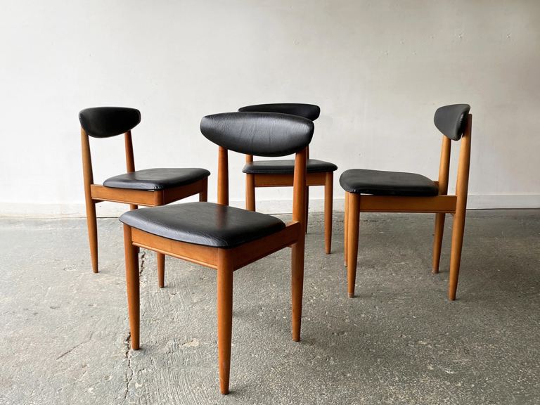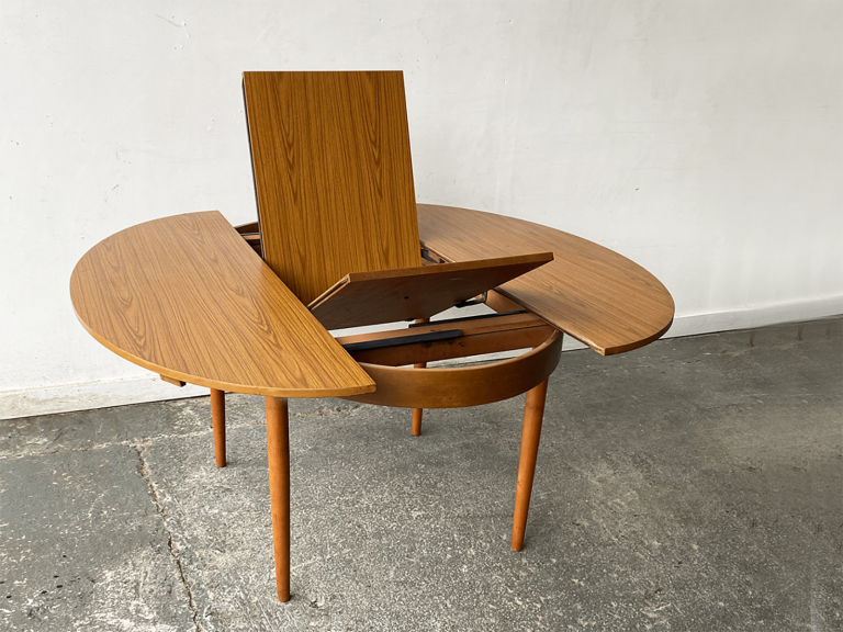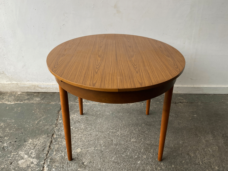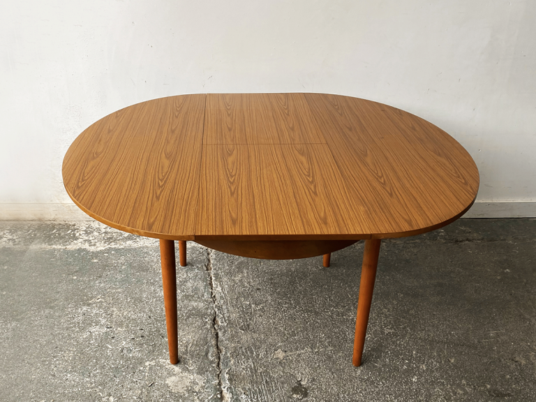 This dining set by Schreiber Furniture is typical of their design. Elegant and minimal design with their trademark wood grain Formica and solid Beech frames. The upholstery is the original black leatherette. The table extends by means of a hinged central flap.