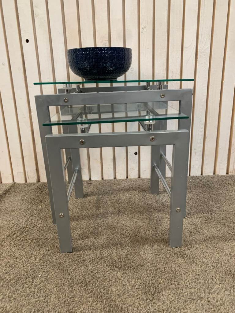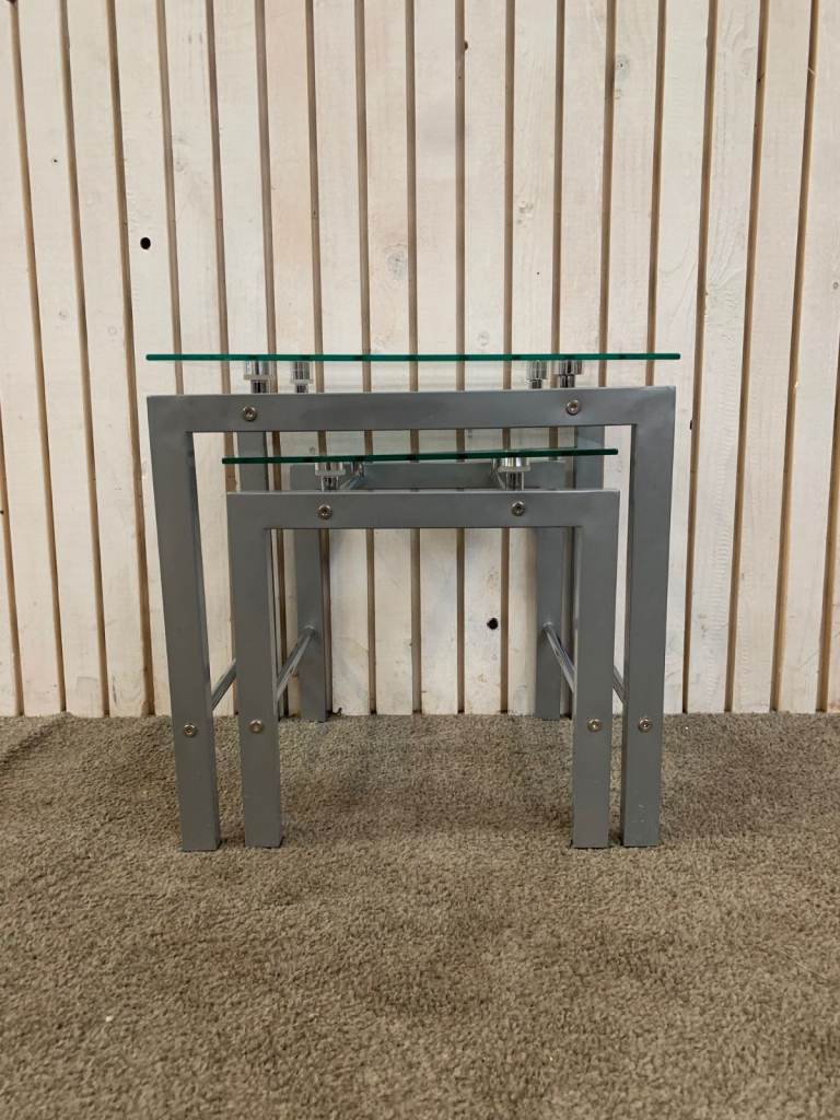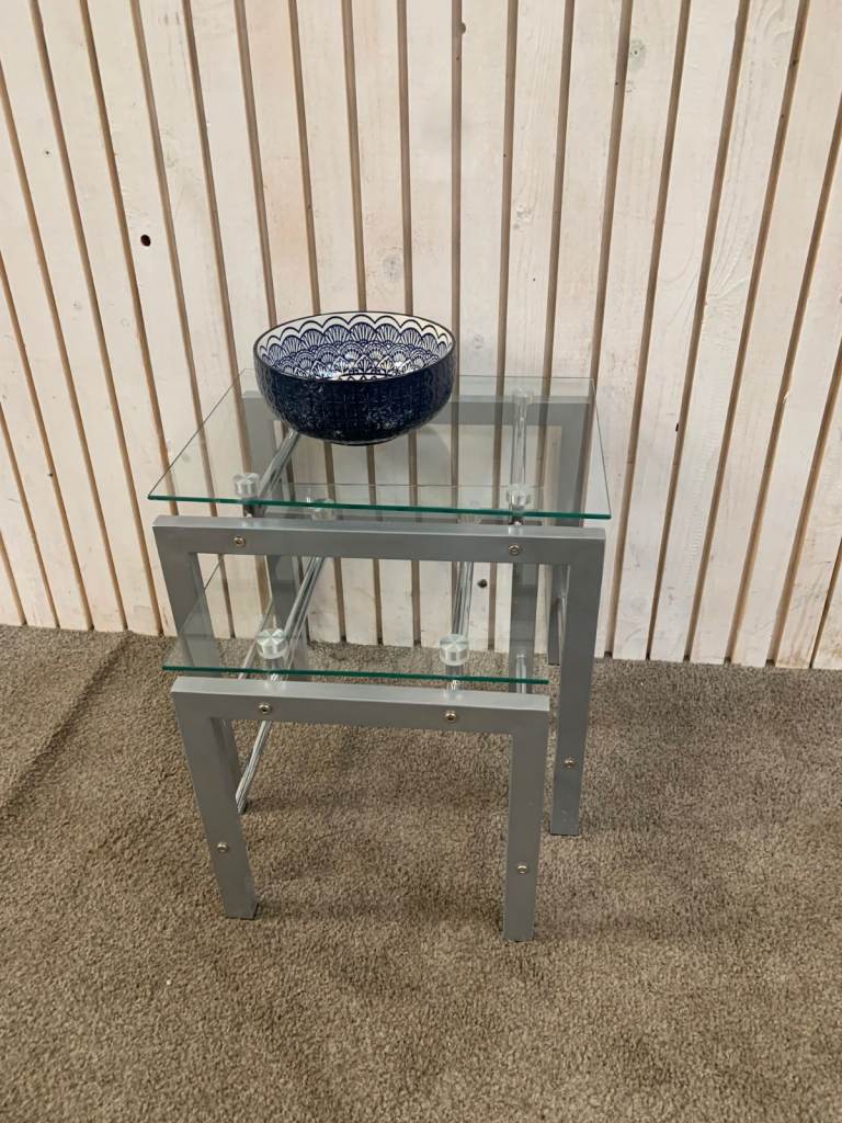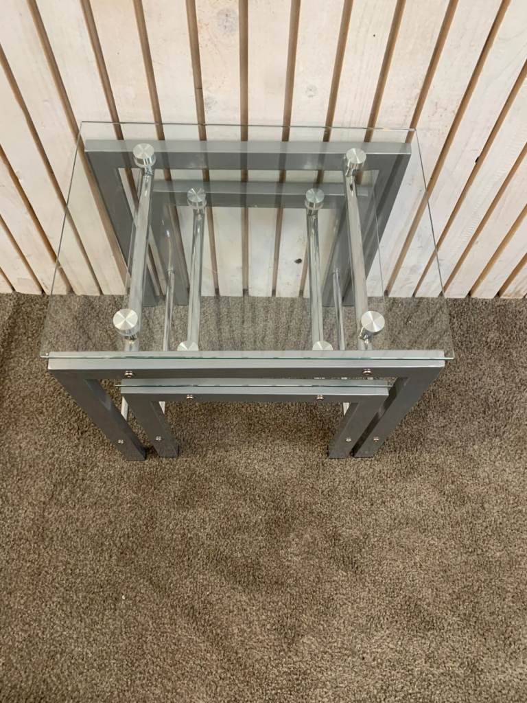 This is a set of 2 Nesting Tables by Nest, featuring a contemporary design with a Rectangular shape. The tables have a Tabletop Material of Metal & Glass, with the tabletop itself made of Glass. The larger table measures 43cm in height, 32cm in length, and 43cm in width. The tables come in a Clear colour and have a stylish Glass and Chrome finish.