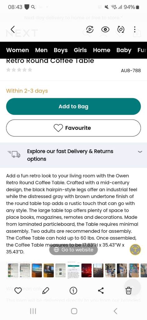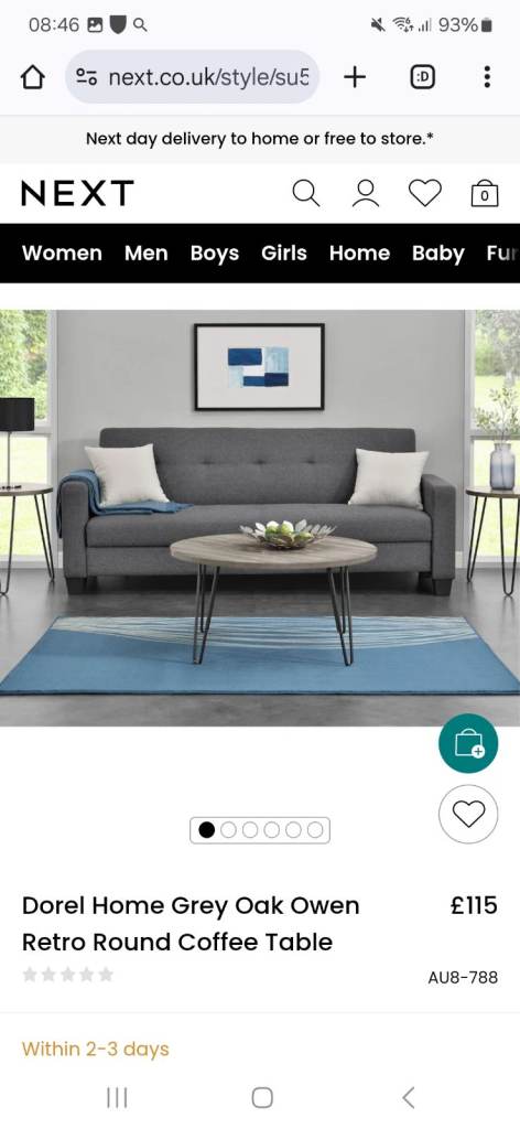 Next round coffee table brand new does cost 119 on next website .Brand new still in box and wrappings similar to one in picture lheight 43 width 96 and depth 96 item is still in wrappings no legs available l will not reply to is this available