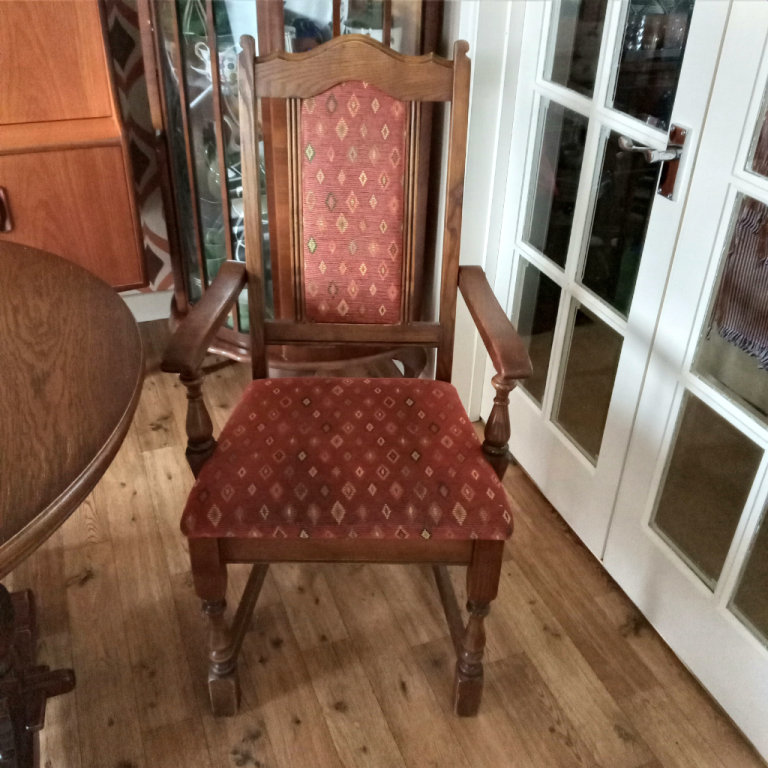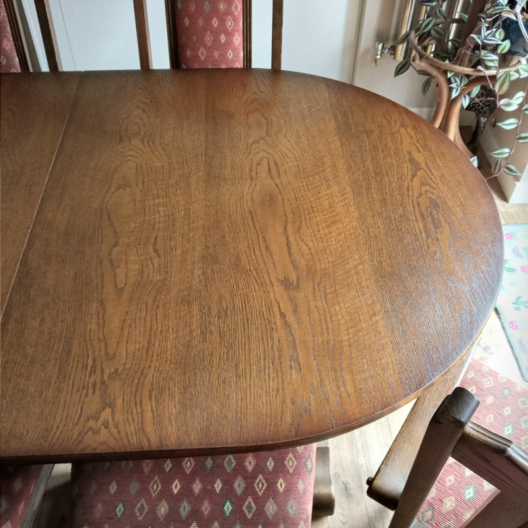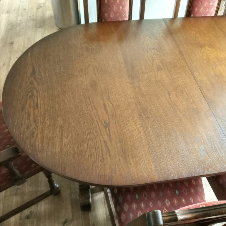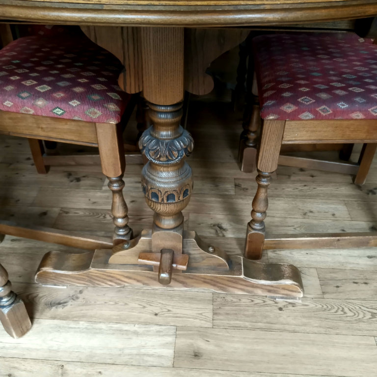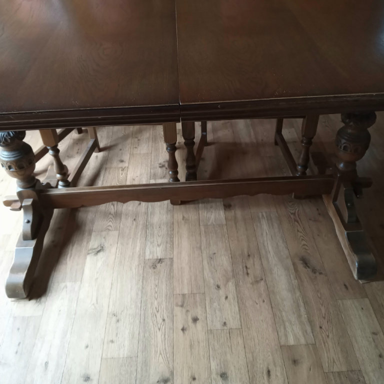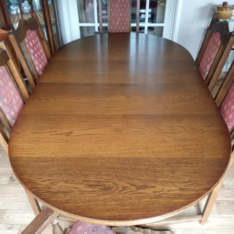 Posting for 2+ yearsOld Charm solid oak dining table 2 carvers and 4 chairs