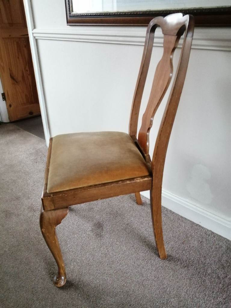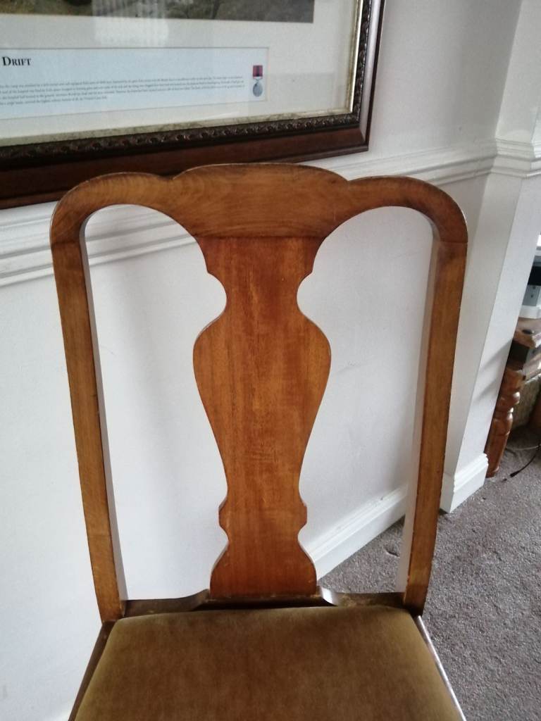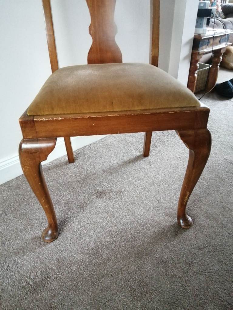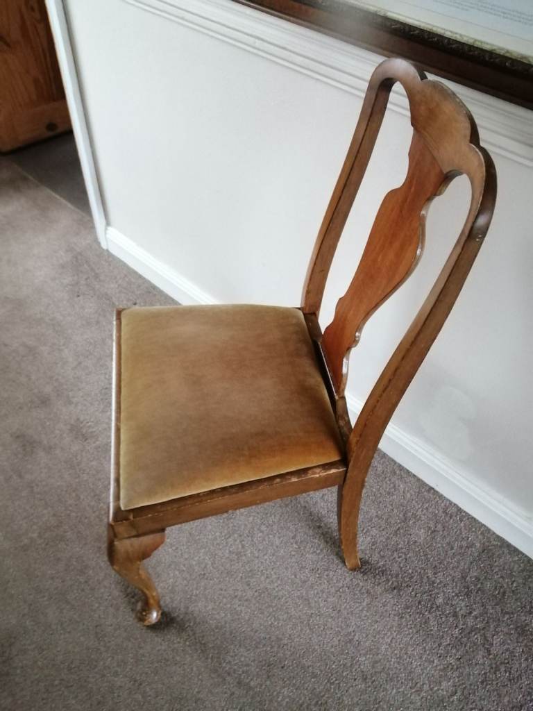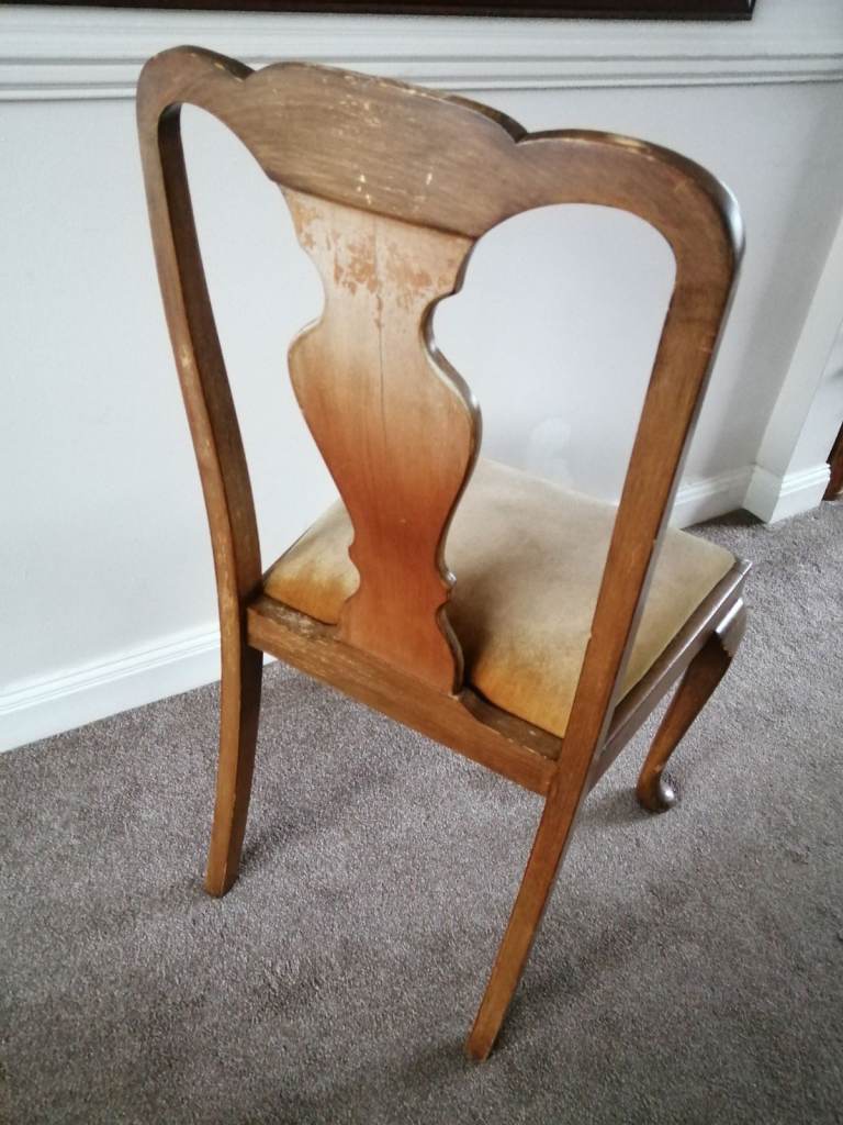 Here we have a Queen Ann style dinning chair complete with cabriole legs. Slight fading to back of center panel. Check out my other listing's I have more chairs!!!!. Thank you