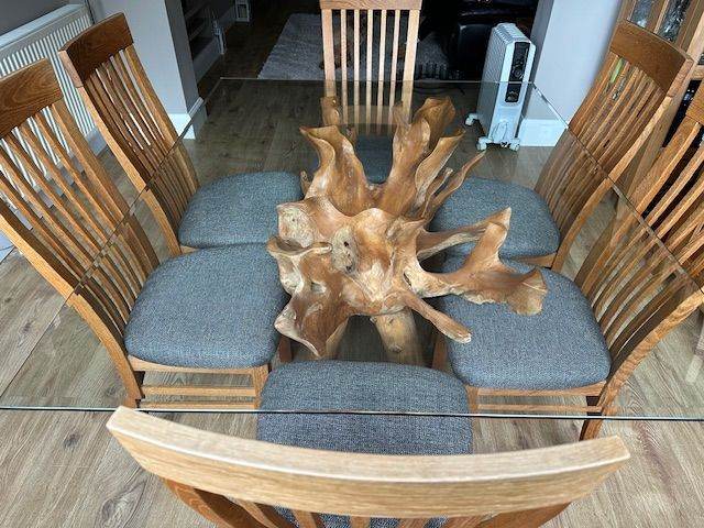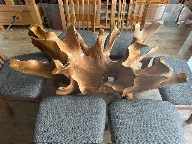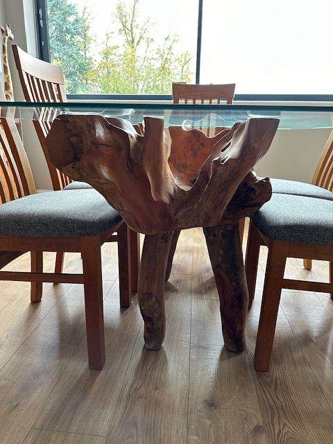 Posting for 1+ yearsReclaimed Teak Root Dining Table with Solid Glass Top and six Dining Chairs