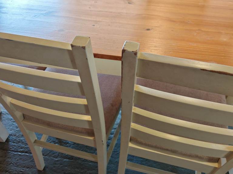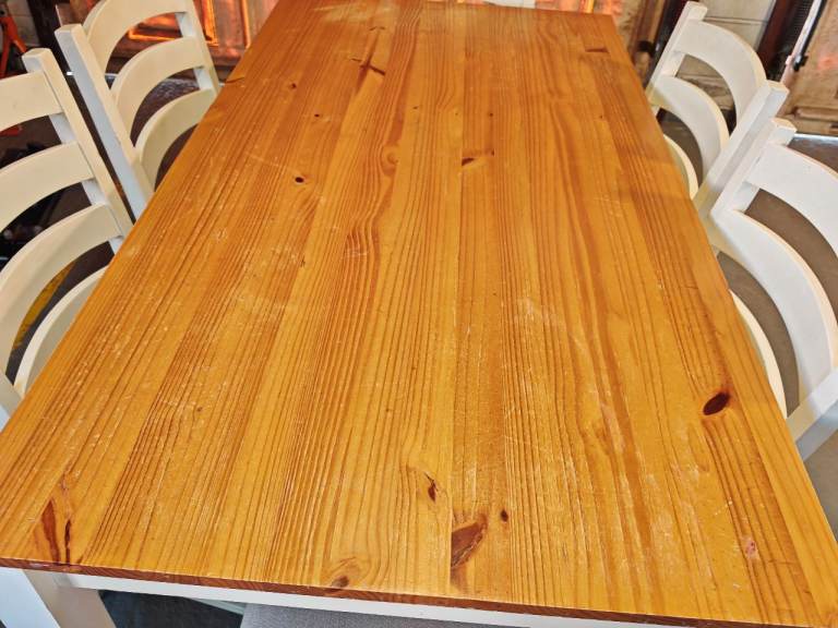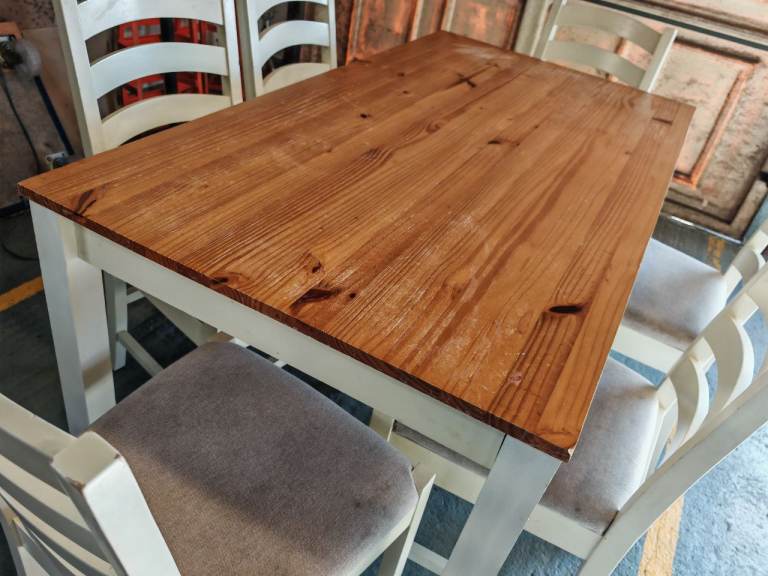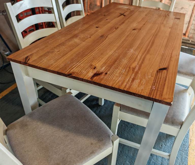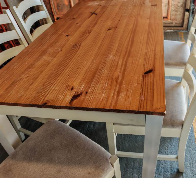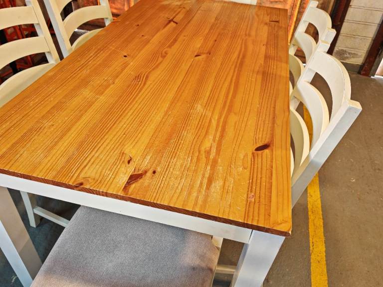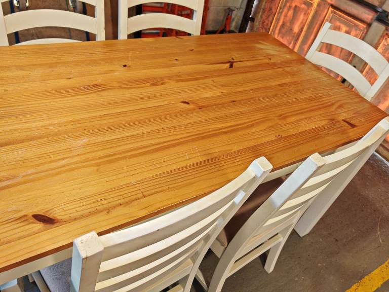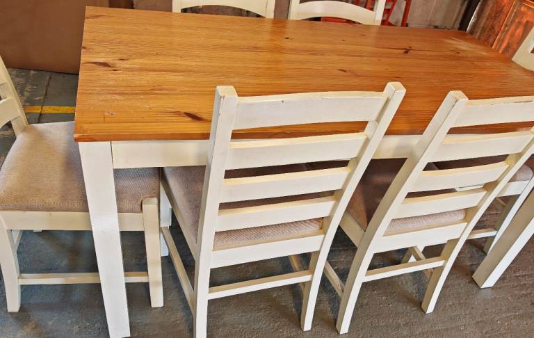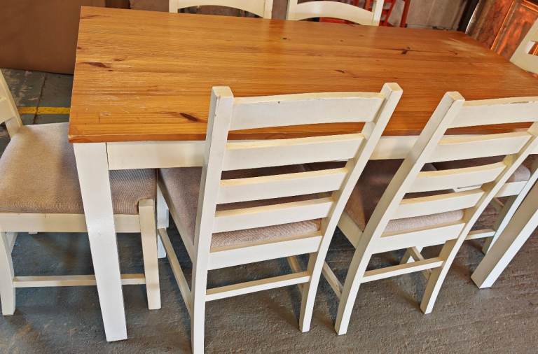 My house is under renovations and some of the furniture is not suitable for the new house. The rectangular dining table with 6 white chairs that I am selling is in good used condition. Sturdy, no wobble. It is from a smoke and pet free home.