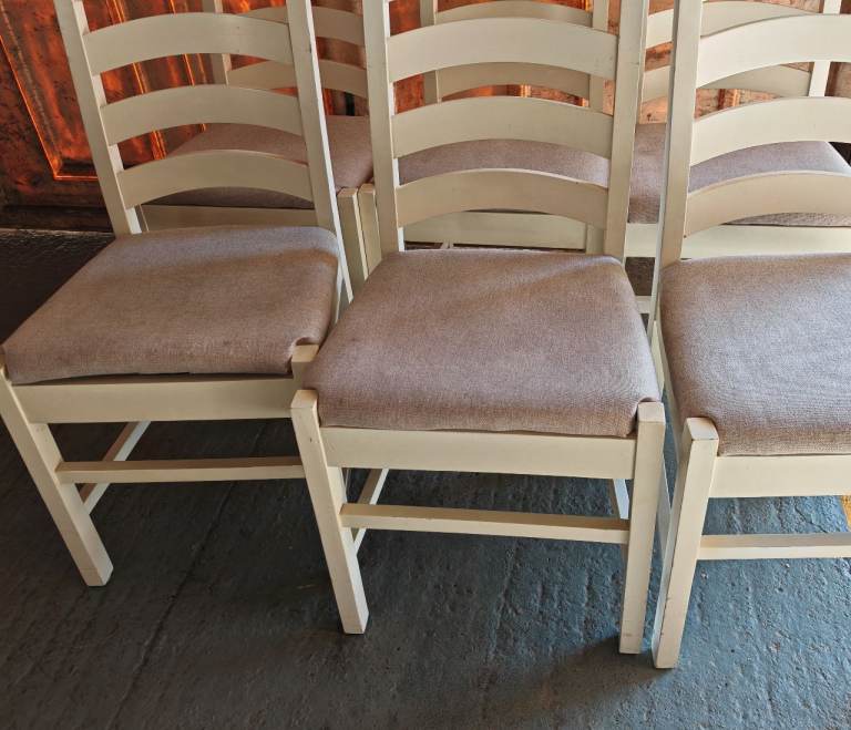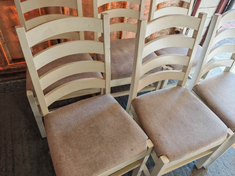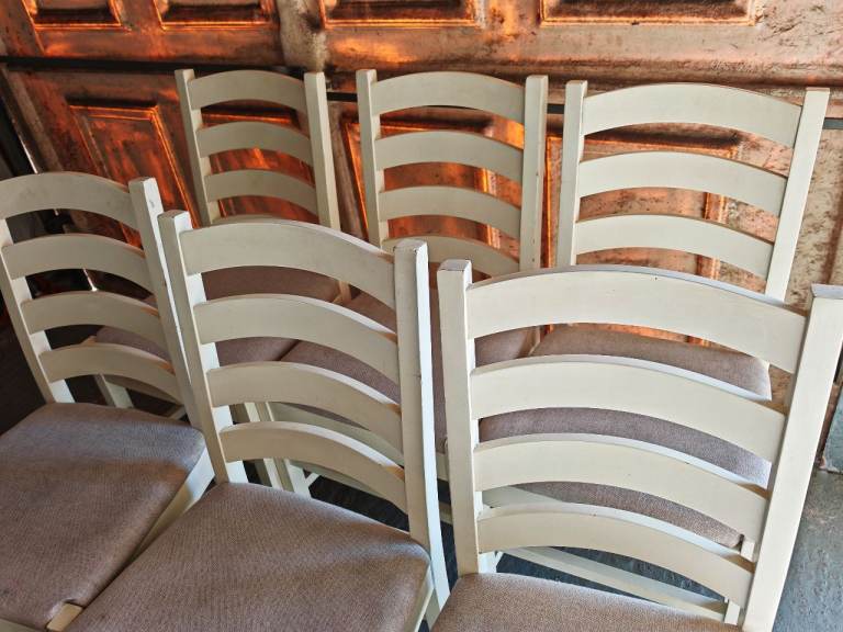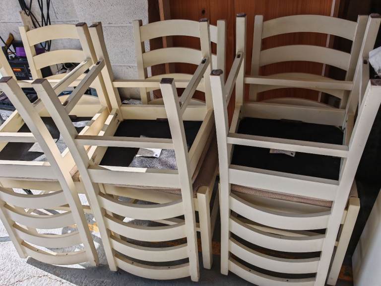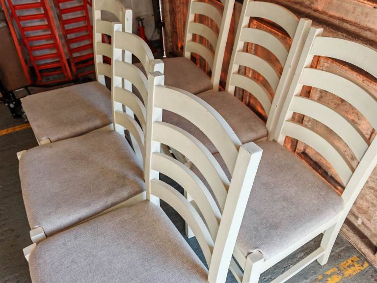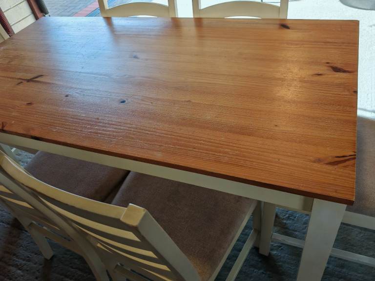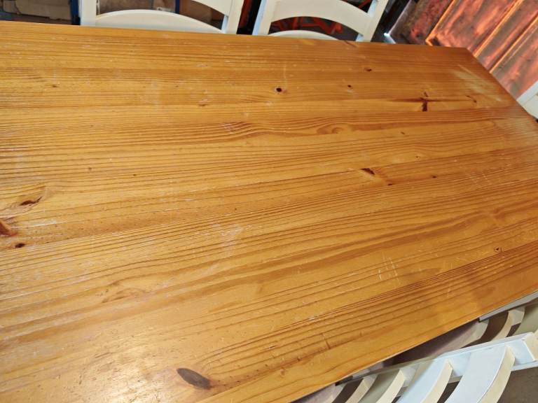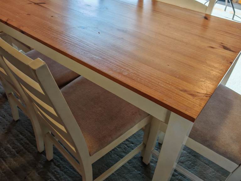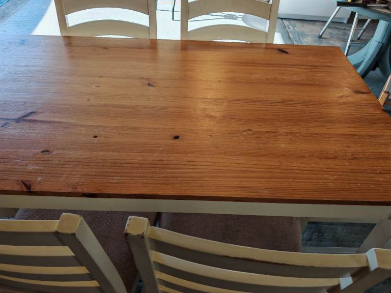 My house is under renovations and some of the furniture is not suitable for the new house. The rectangular dining table with 6 white chairs that I am selling is in good used condition. Sturdy, no wobble. It is from a smoke and pet free home.