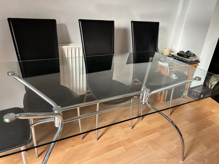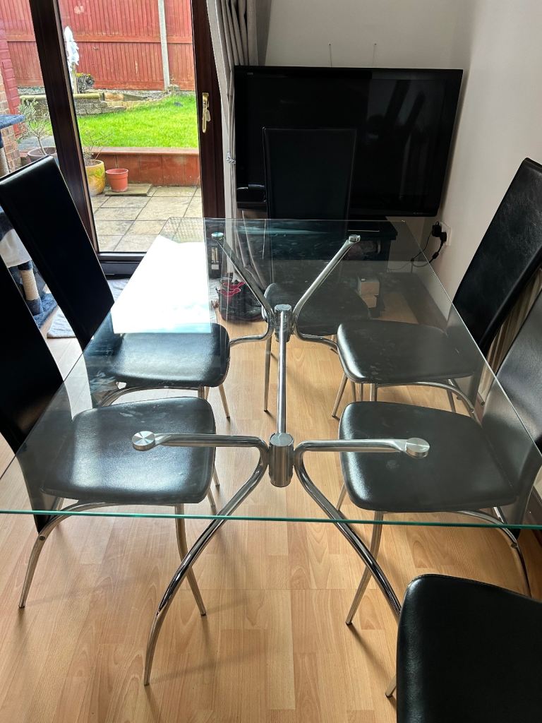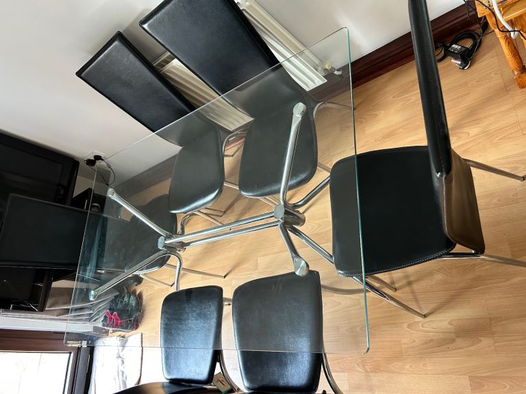Reduced: Stylish Glass Dining Table 150 x 90cm Glass corners curved. Chrome legs. In very good condition. Seats 6 comfortably. High back dining chairs. Black. Leather look. Wipe clean. Chrome legs. 6 chairs available. vgc. Fire safety. OVNO