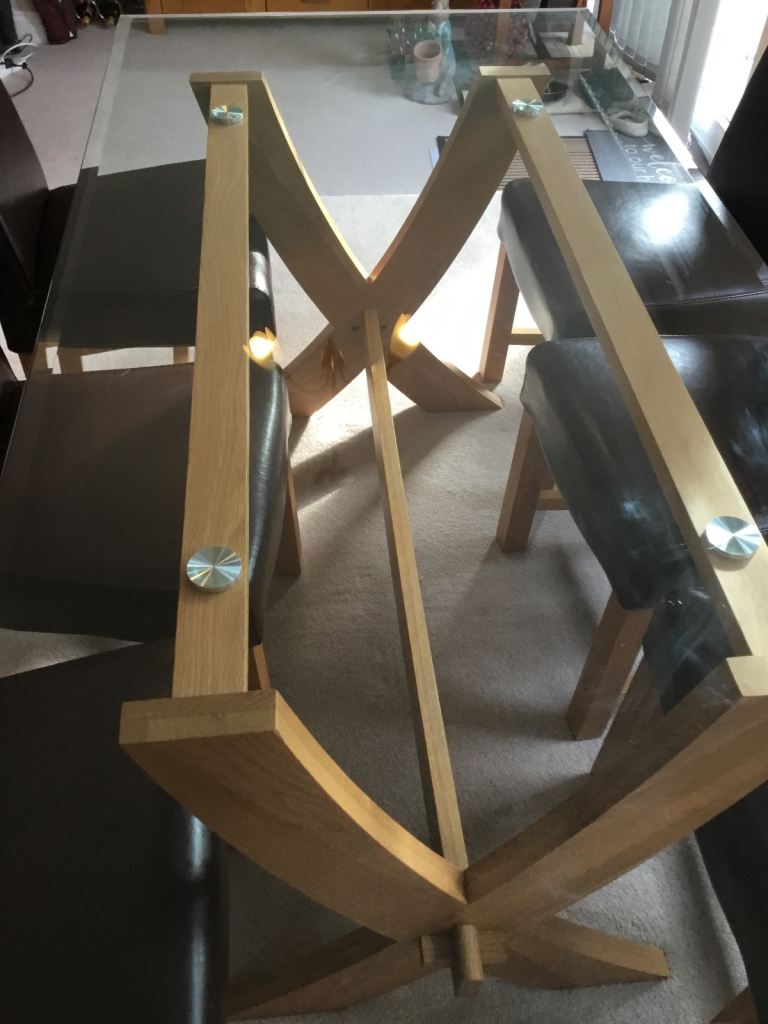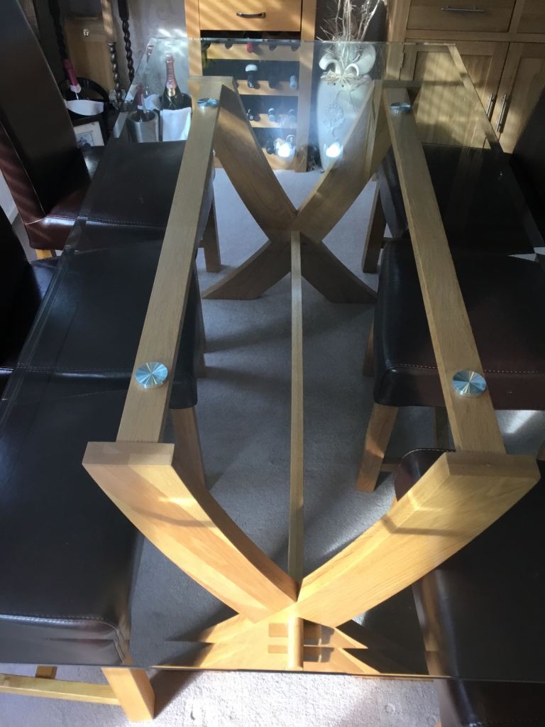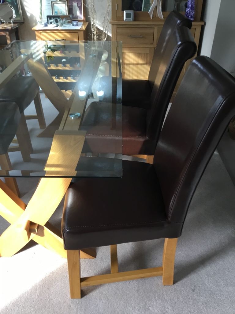 The Reflection dining table features a sleek and modern design, with a 6ft by 3ft glass tabletop supported by natural solid oak crossed legs. Standing at 75 cm in height, this dining table exudes a natural theme with its oak material and clear glass top. The table offers a spacious surface area of 180 cm in length and 90 cm in width, making it ideal for hosting gatherings and meals in a stylish setting. Comes with 4 leather Braced scroll back chairs in brown leather with solid oak legs. Purchased from Oak Furniture Land. Table in excellent condition, very slight wear on a couple of chairs.