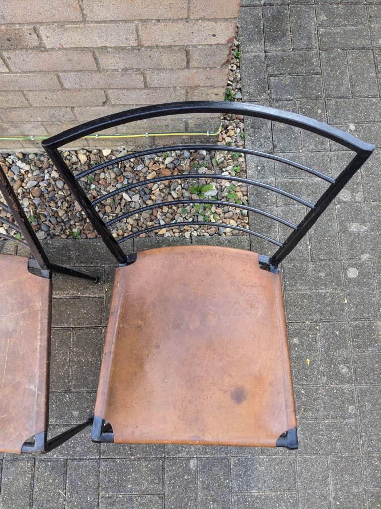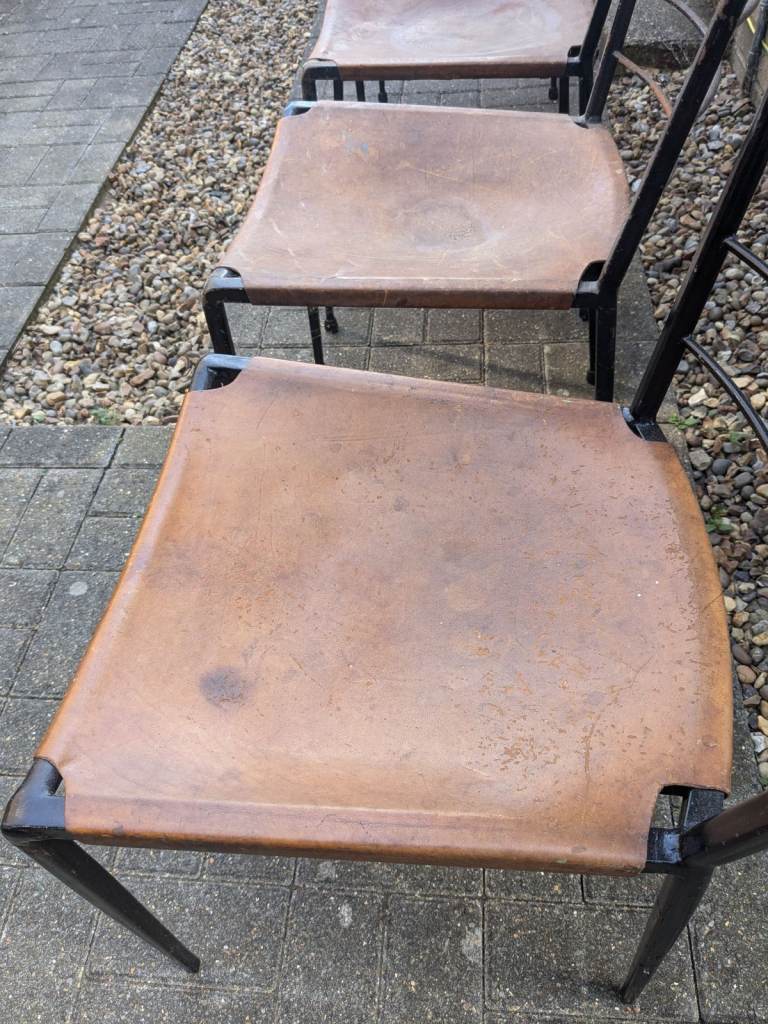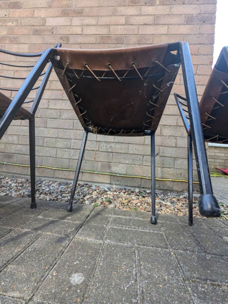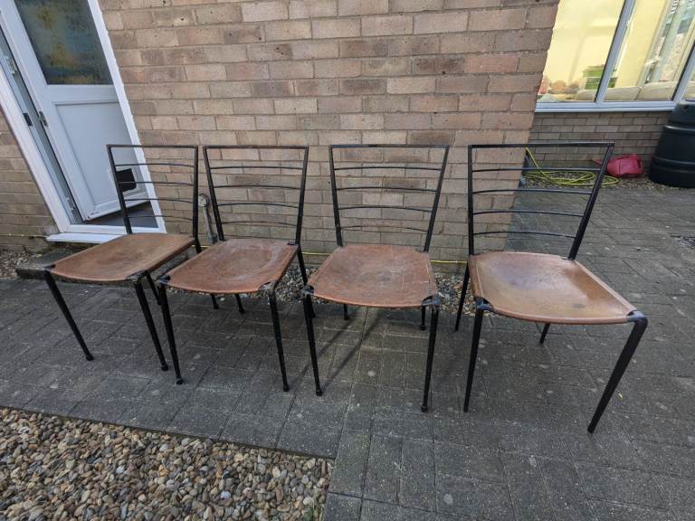 Black satin sprayed metal frames, showing wear consistent with age, some paint has been retouched on one of the chairs but the others are untouched.