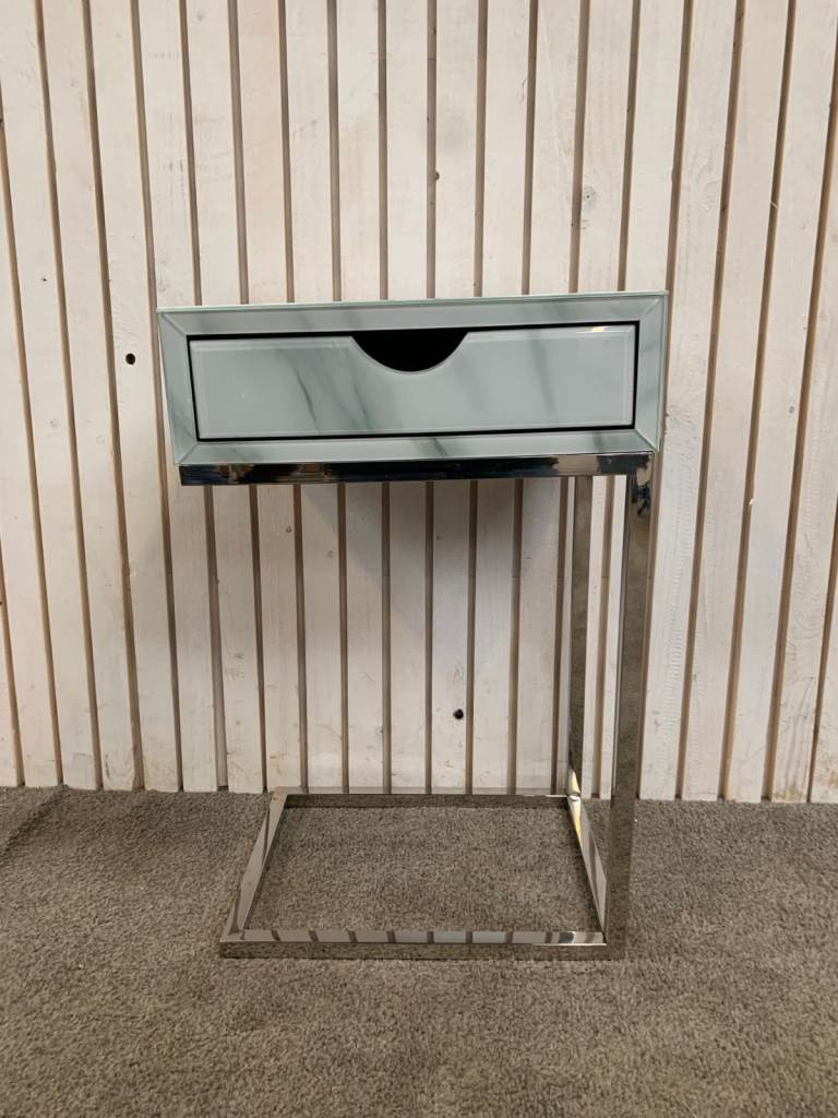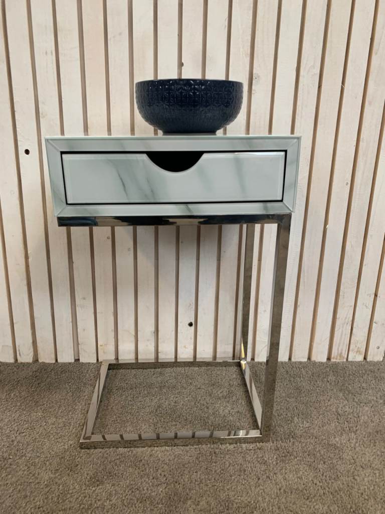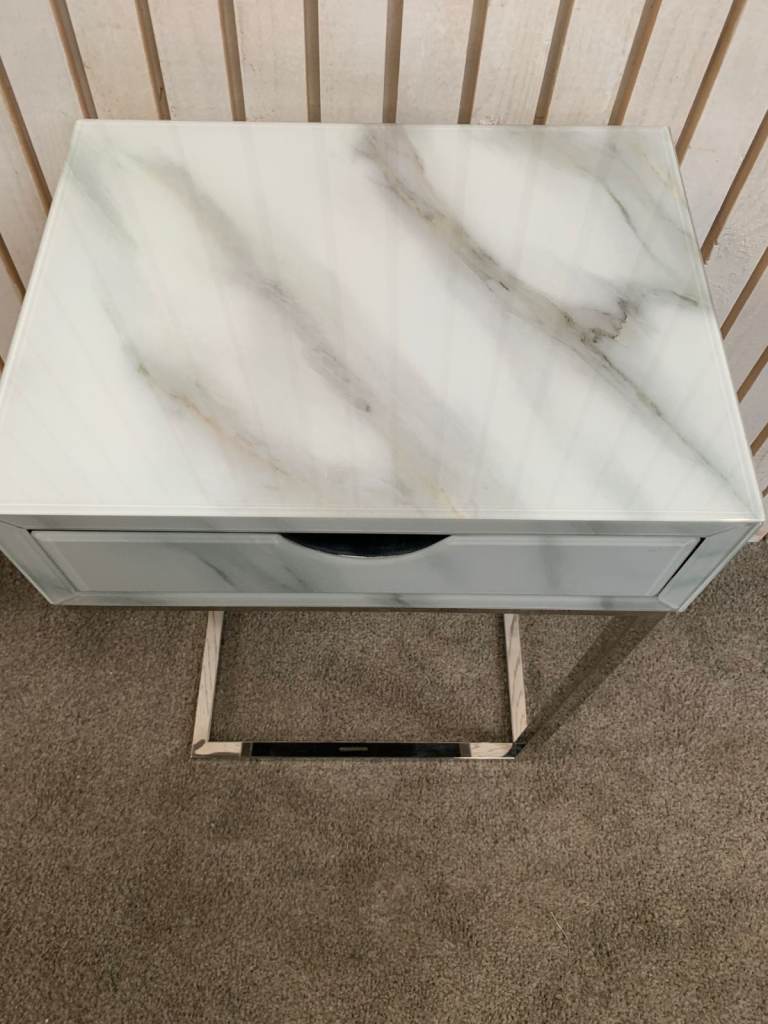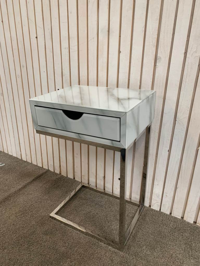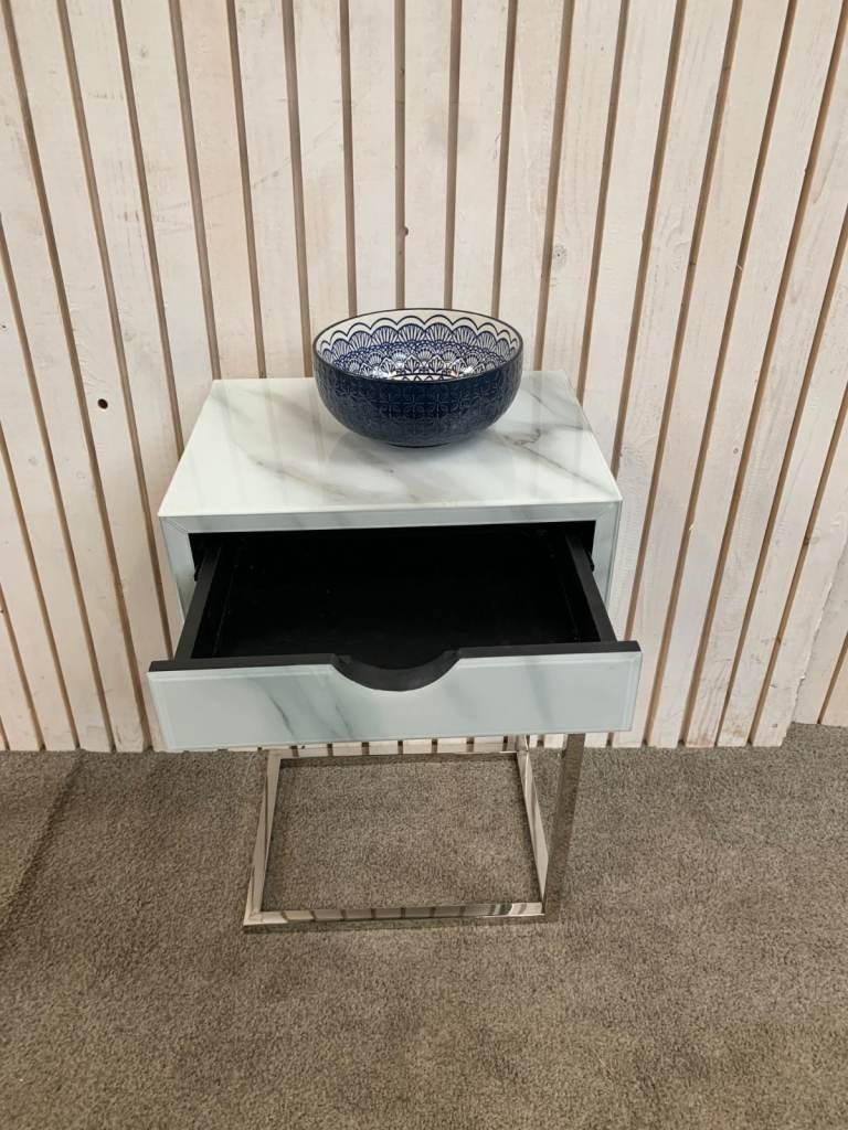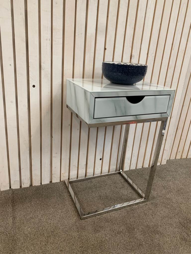 This is a rectangular side table with a glass tabletop in white colour. It has a modern design with a chrome frame, measuring 62cm in height, 31cm in length, and 41cm in width. The table is stylishly crafted with a glass marble top, providing a sleek and elegant look for any room.